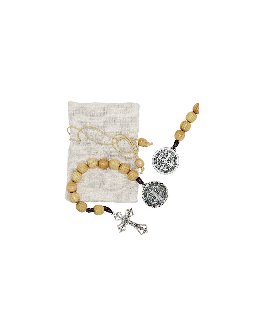 Zehnerrosenkranz mit Benediktusmedaille – Naturholz und Stoffbeutel