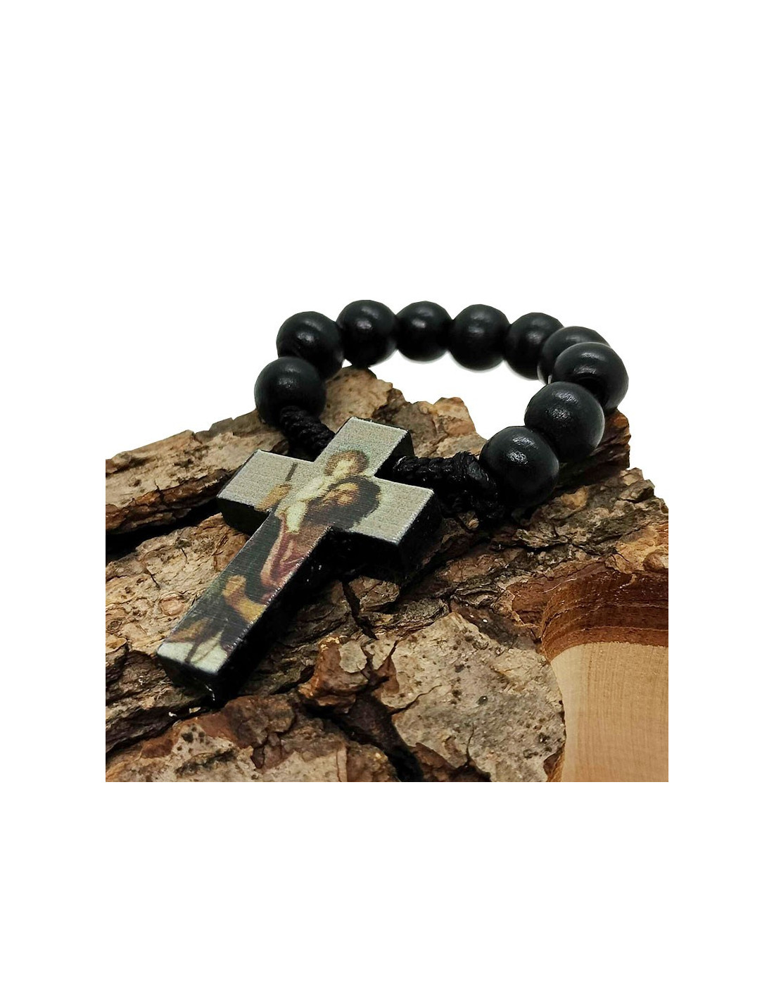 Zehn aus schwarzem Holz. Das Kreuz Christi besteht aus schwarzem Holz mit der in Gold bemalten Jesusfigur und dem Porträt des Heiligen Christophorus auf der Rückseite. Dieser Zehner hat ein kleines Taschenformat und ist praktisch, um ihn überallhin mitzunehmen.