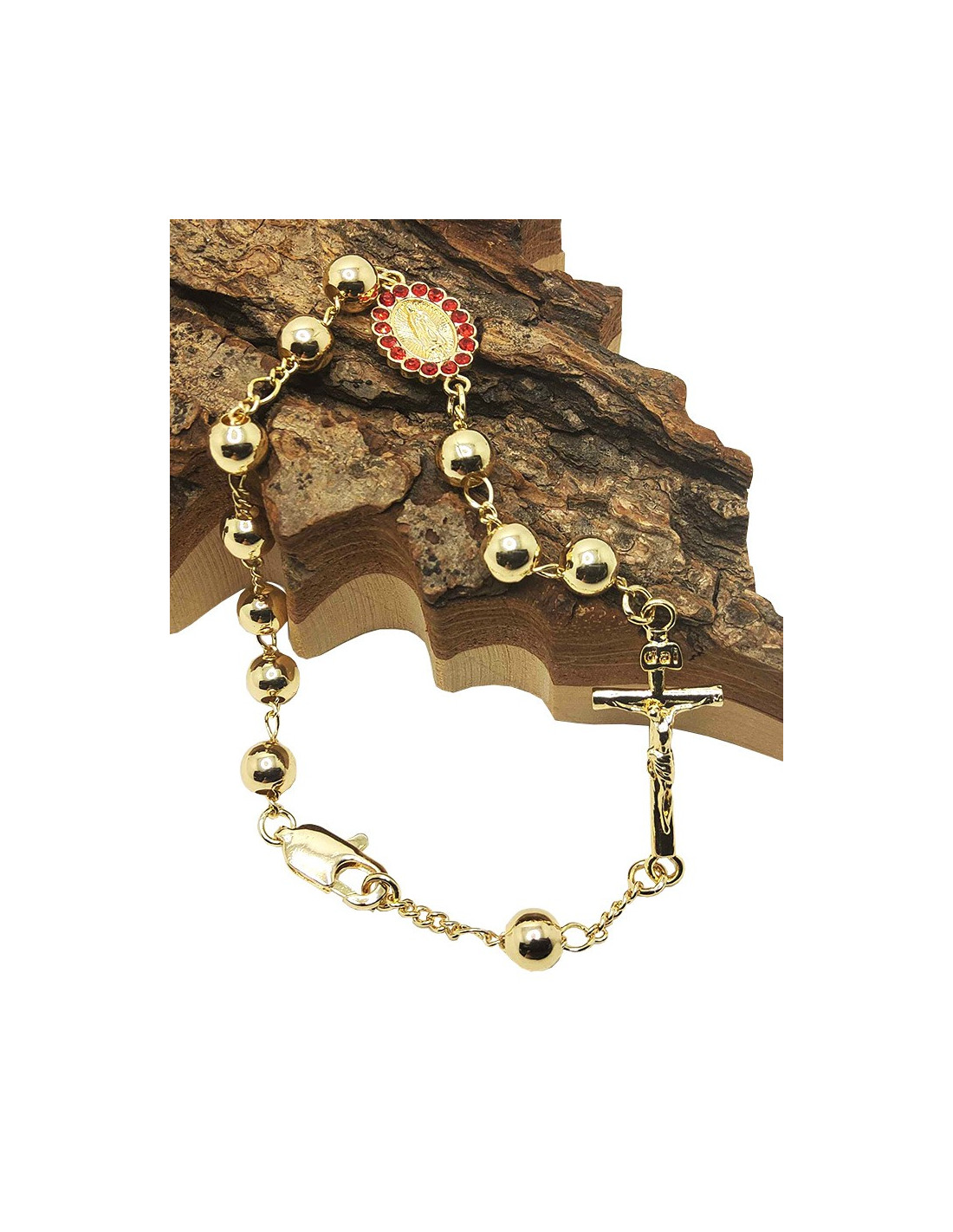 Dieses Zehnerarmband aus vergoldetem Kupfer ist mit facettierten Perlen in einheitlichen Goldtönen, einer eleganten Medaille der Jungfrau Maria und einem Kreuz verziert. Ein raffiniertes Schmuckstück, das sich perfekt als Begleiter für Momente des Gebets oder als elegantes Accessoire für den Alltag eignet.