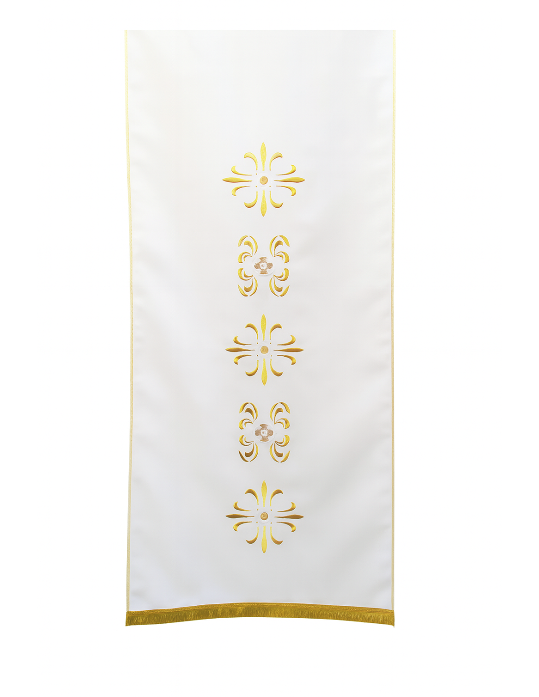 Cream-white lectern veil with stylized floral motifs highlighted with golden thread.