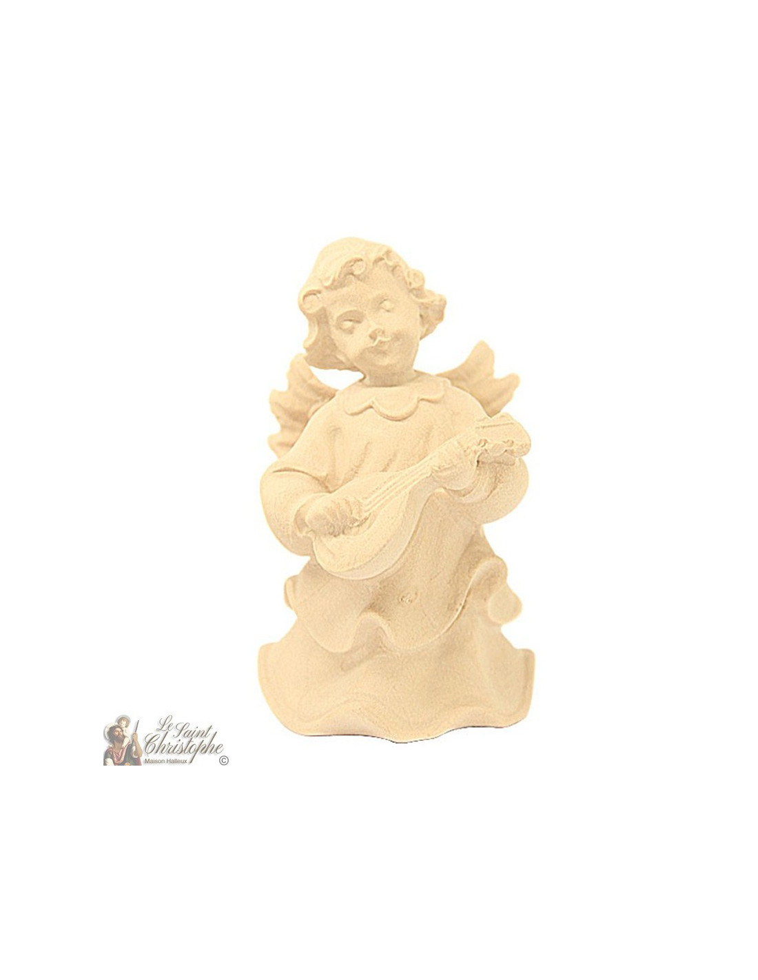 Little musician angel in a long toga playing the mandolin, carved in a clear natural wood.