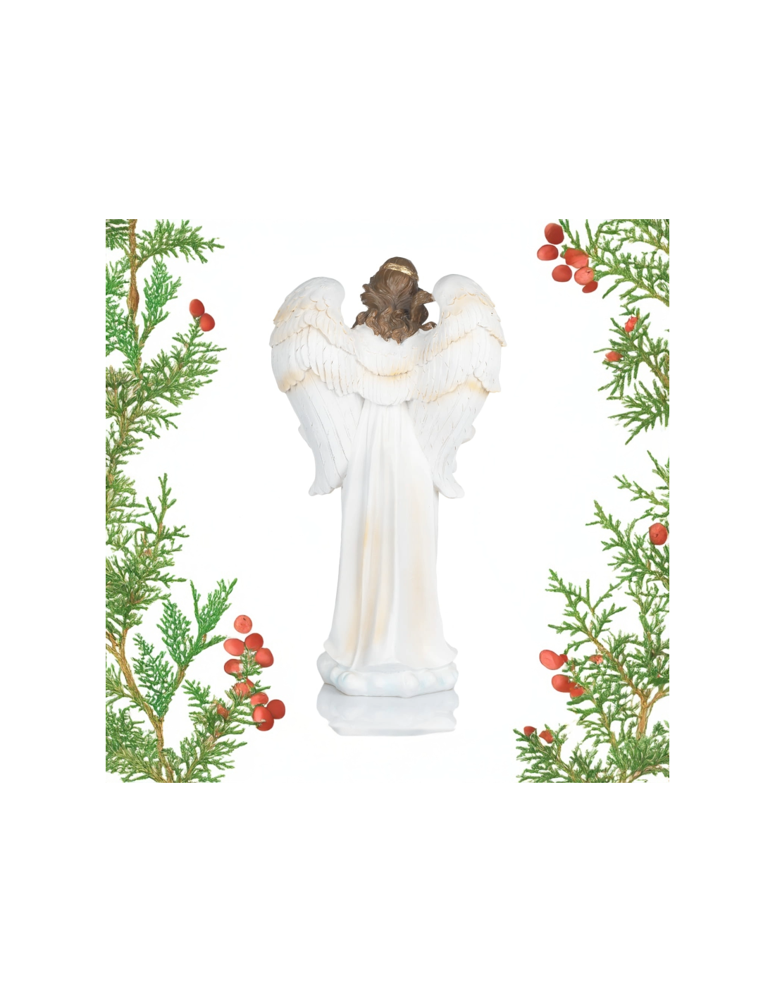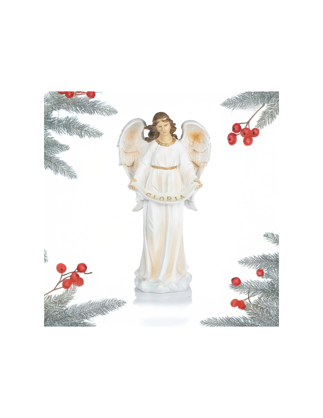 The angel, dressed in a white robe with golden accents, spreads her finely detailed wings and holds a banner inscribed with “GLORIA” in golden letters. Every detail – from the flowing drapery to the serene and gentle facial expression – reflects careful and refined craftsmanship.