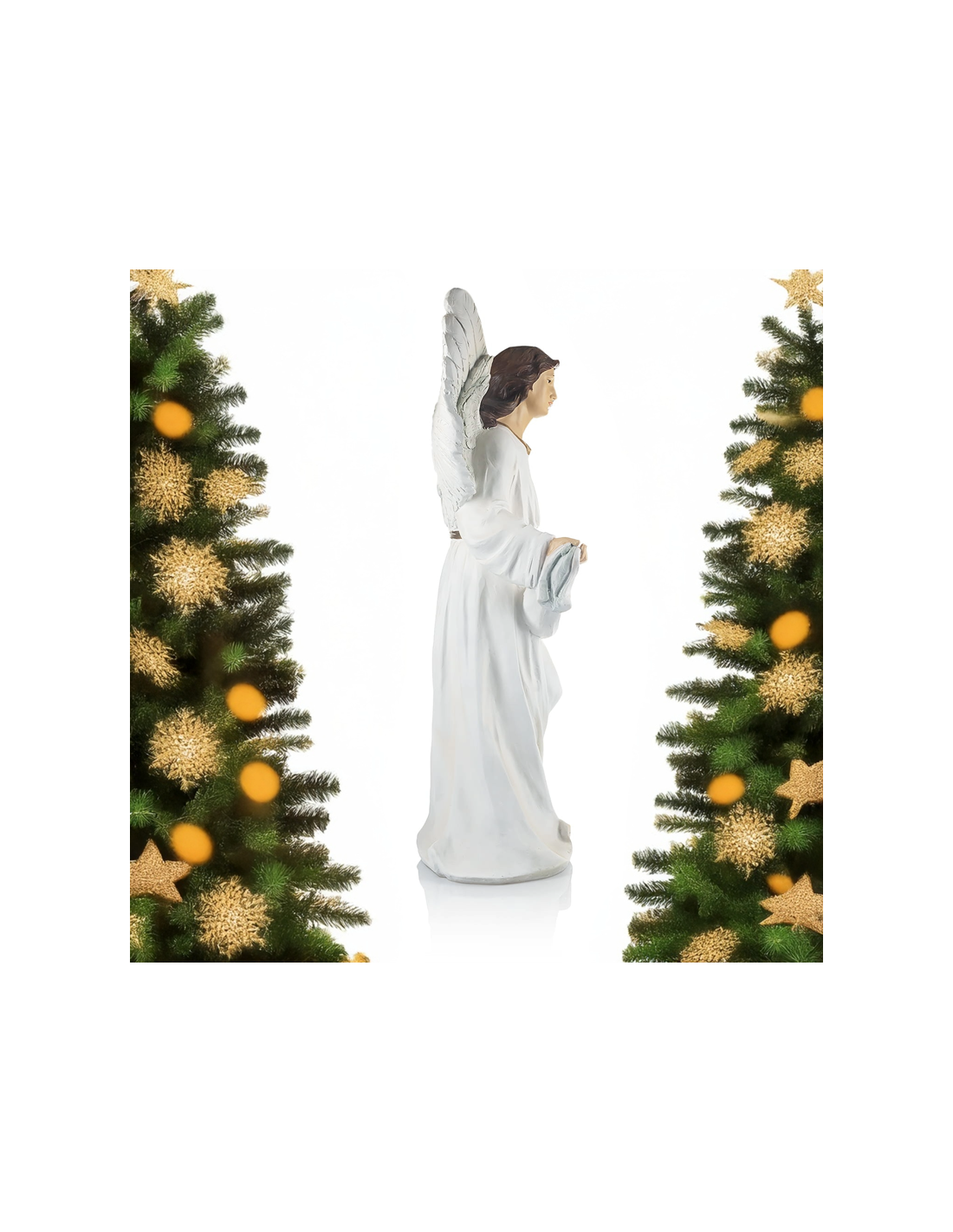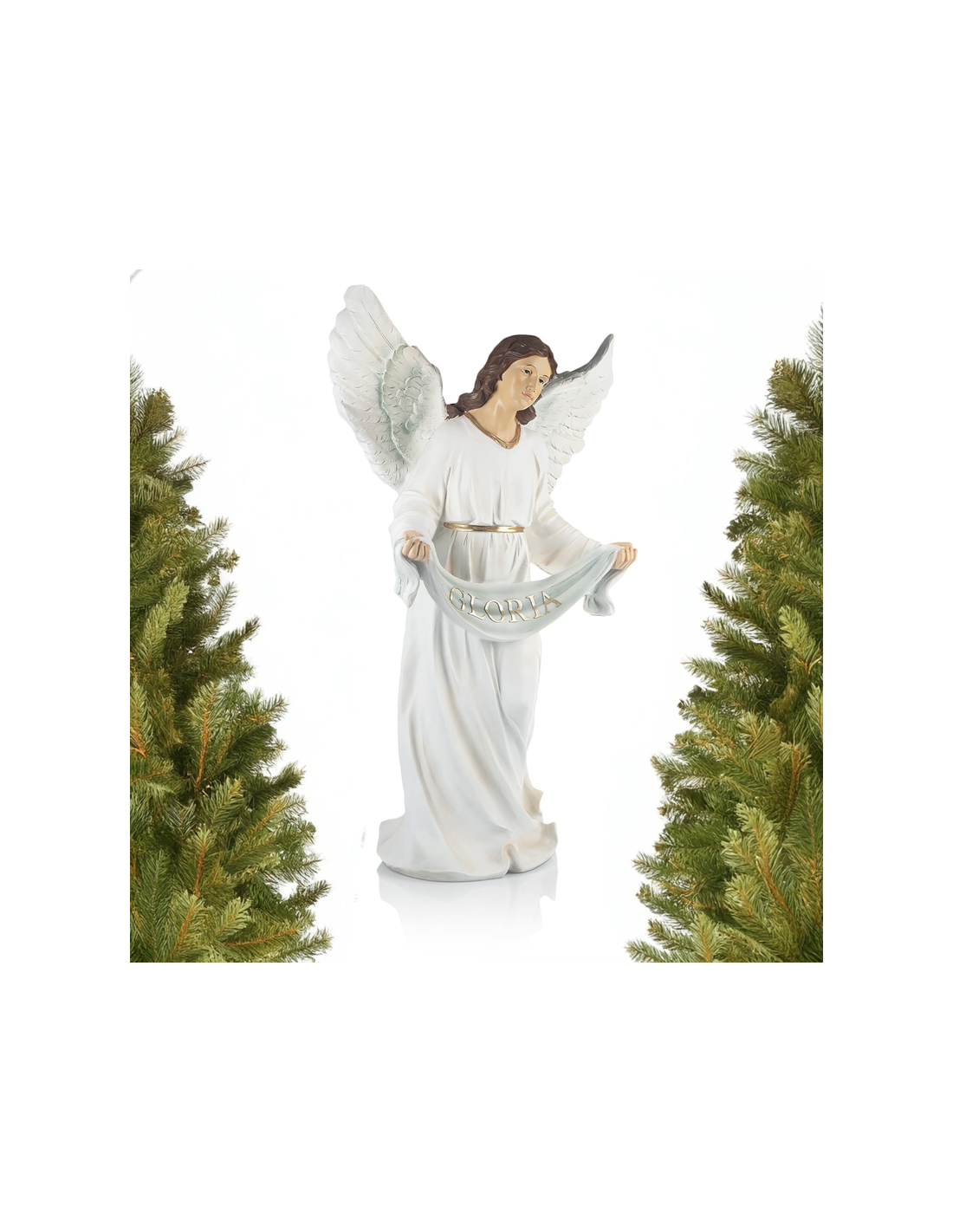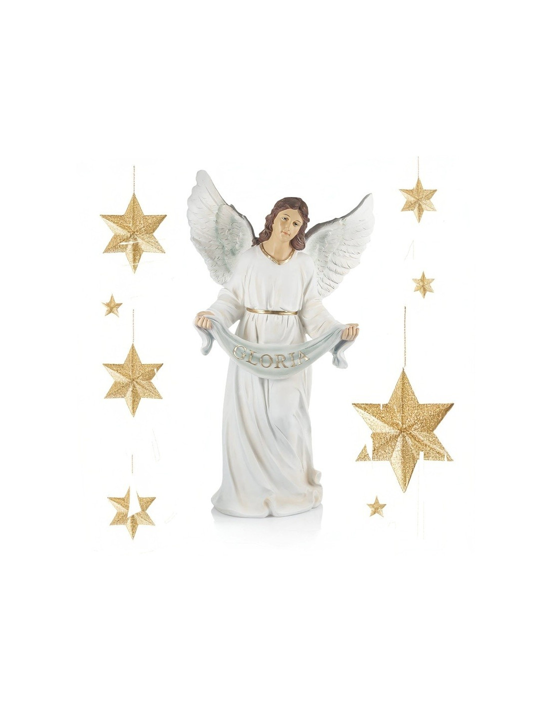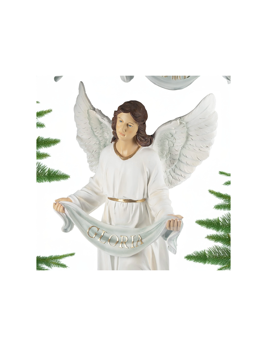 The angel, dressed in a white robe with golden accents, spreads her finely detailed wings and holds a banner inscribed with “GLORIA” in golden letters. Every detail – from the flowing drapery to the serene and gentle facial expression – reflects careful and refined craftsmanship.
