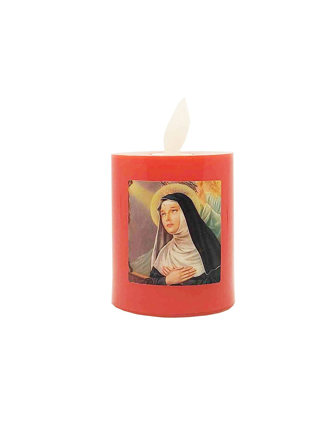 Red plastic LED candle which, when lit, gives a real candle flame effect thanks to a moving screen mechanism. This candle features the effigy of Saint Rita.