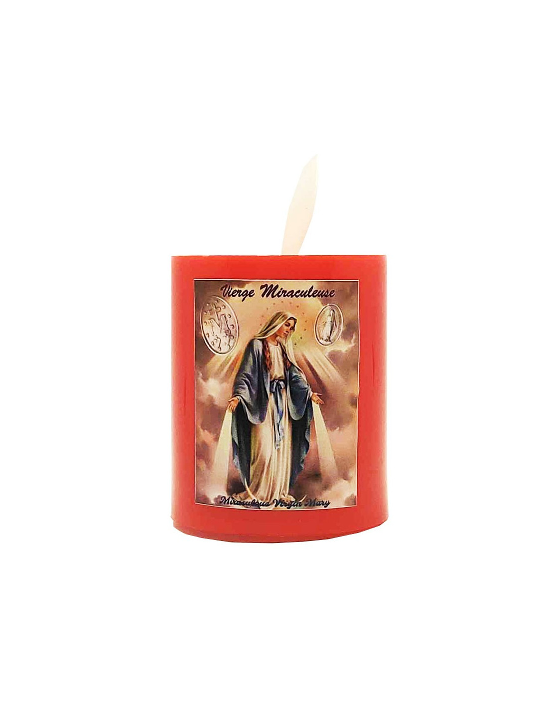 Red plastic LED candle which, when lit, gives a real candle flame effect thanks to a moving screen mechanism. This candle features the effigy of the Miraculous Virgin.