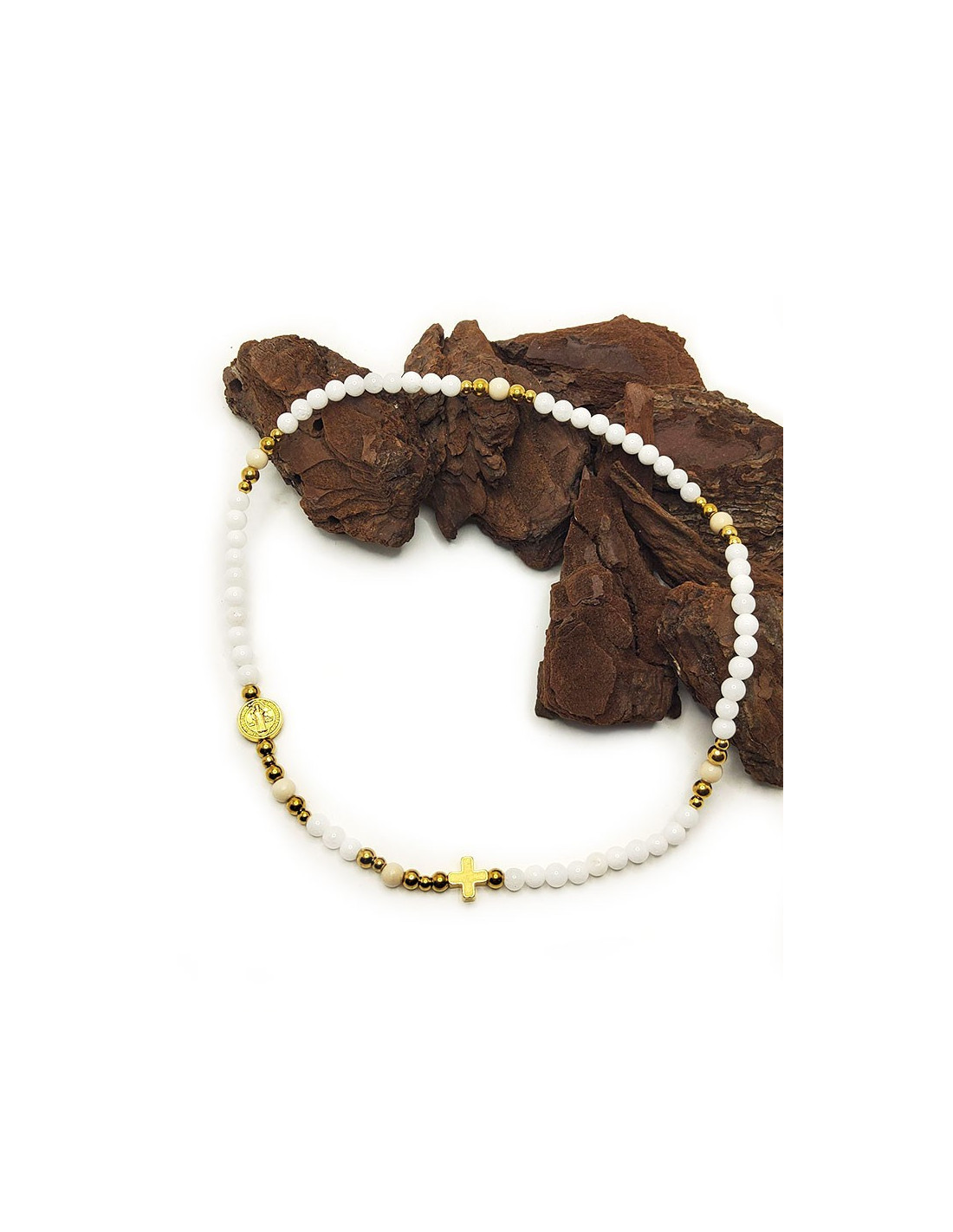 Elastic bracelet with glass and gold-plated steel beads forming a rosary suitable for prayer. The rosary medal is the Saint Benedict Medal, a powerful symbol of protection against evil and negative energies. The gold-plated metal beads are enhanced by the white and creamy white glass beads. The size of the beads varies depending on their placement in the rosary. This refined piece of jewelry is an elegant everyday prayer tool.