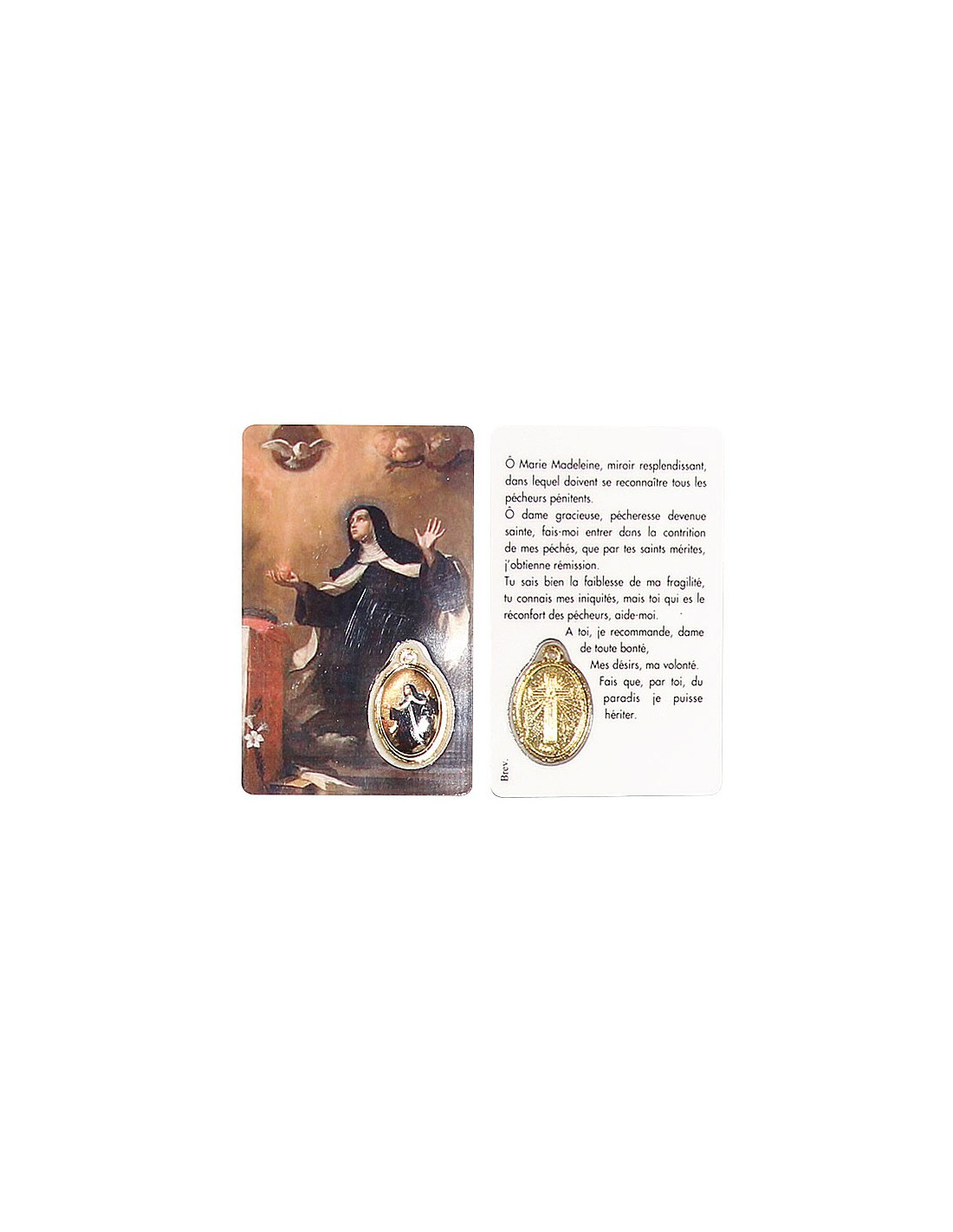 This card-medal honors Saint Mary Magdalene. Fits in a pocket or wallet, the laminated card is printed with a painting of Saint Mary Magdalene and a prayer in her name. It is adorned with a medal of Saint Mary Magdalene, which you can cut out to wear as a pendant or leave with the card as a keepsake.
