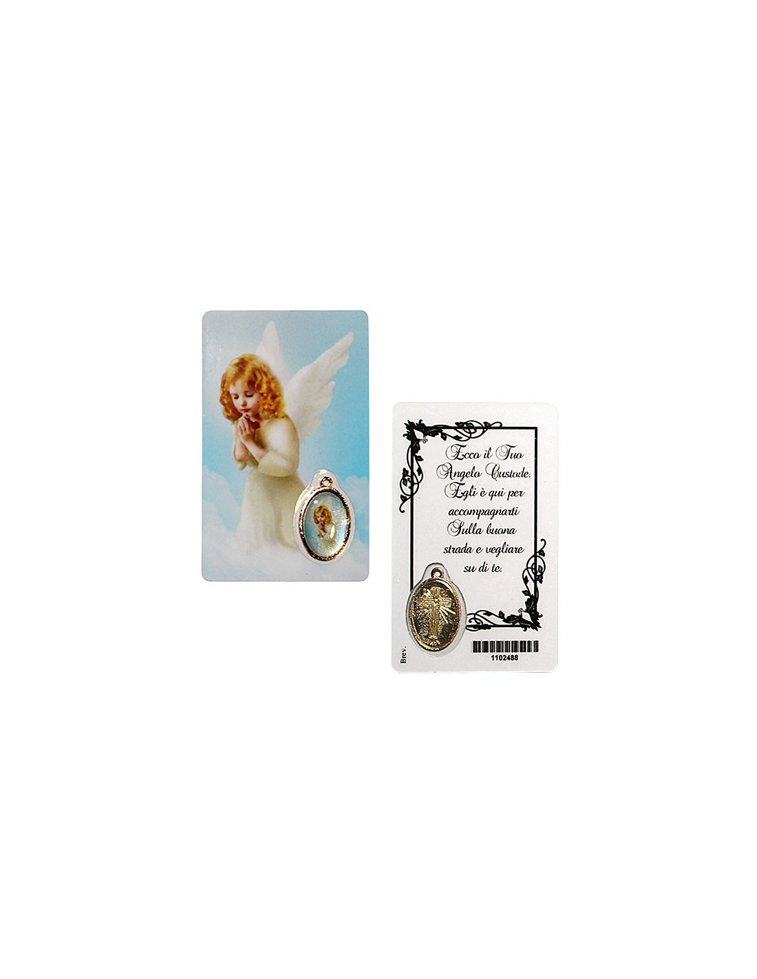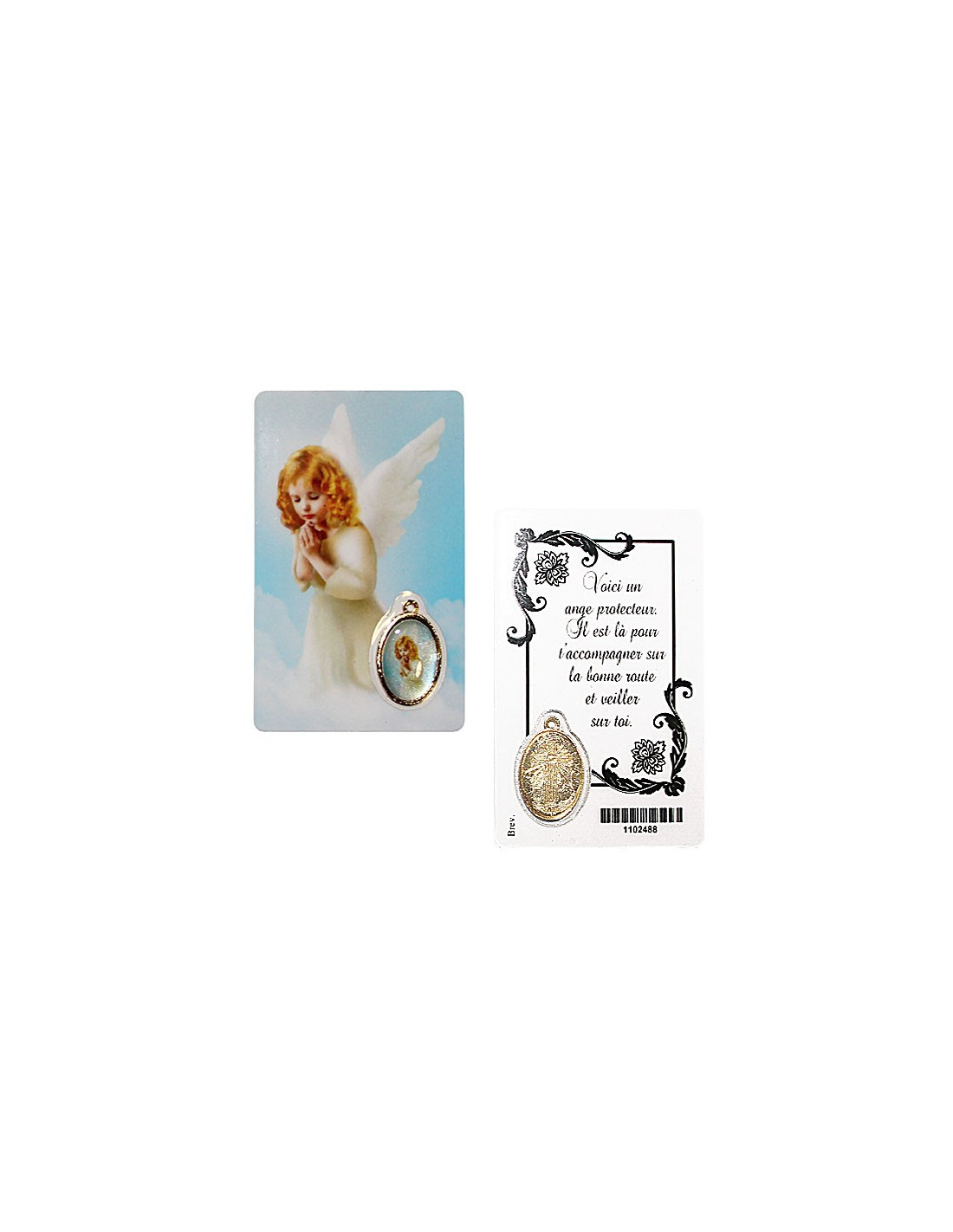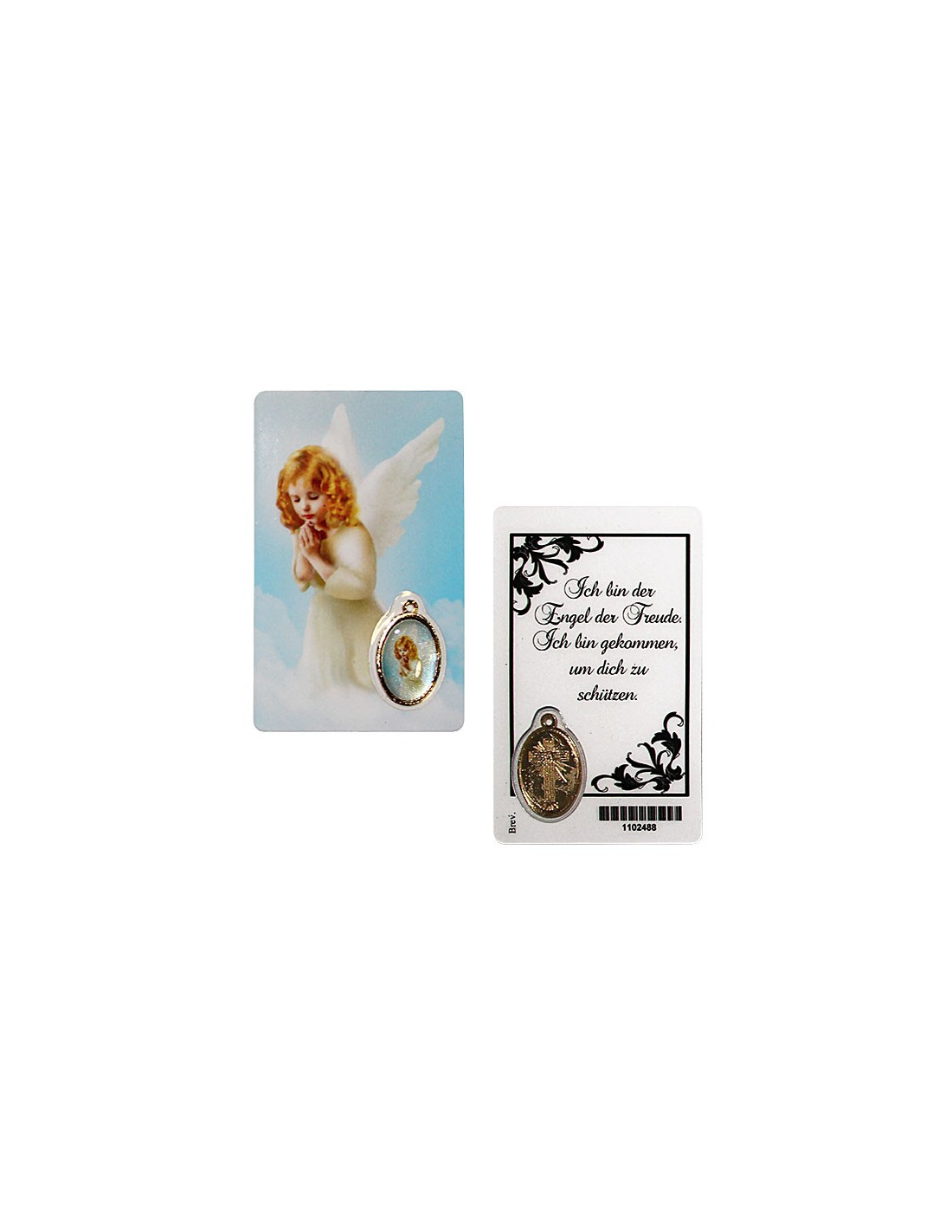 Laminated card, bank card size, with painting, prayer and medal of the Protective Angel. The golden medal is in color. A perfect gift to give to a child, a friend, and for all those you love.