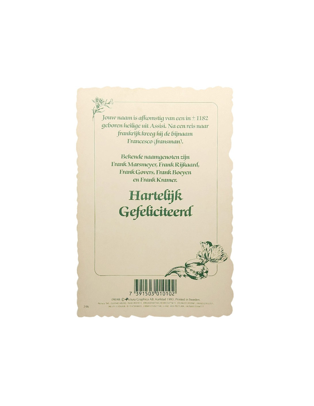 This personalized postcard presents a first name, its etymological meaning and some of the famous people who bear it. Printed on high-quality cardboard with an elegant die-cut, it's adorned with a colorful vintage-style floral frame. Perfect for a simple, original gift for a birthday, christening or symbolic note. A great way to offer a nod to a loved one's identity.