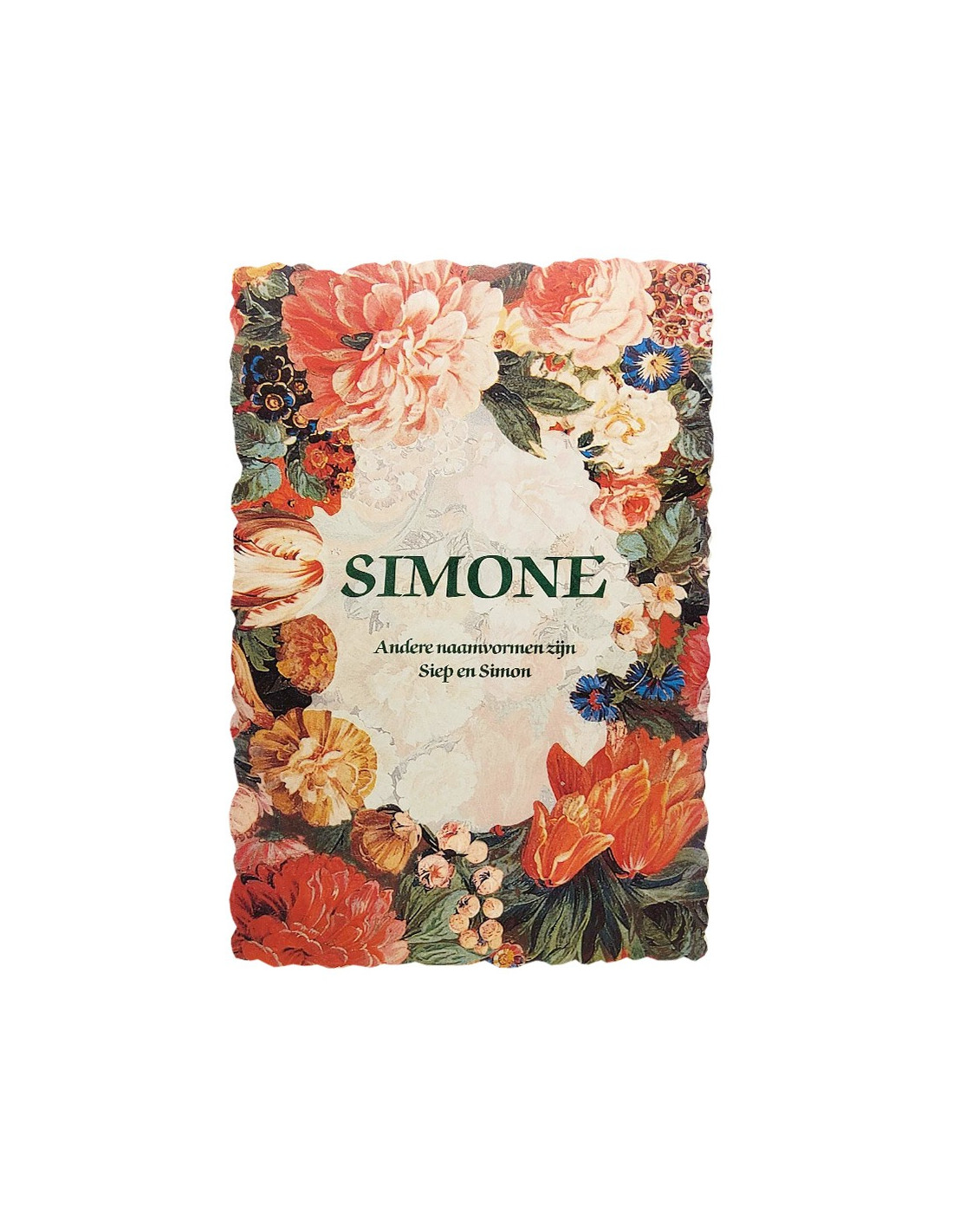 First-name postcard for people named Simone, decorated with flowers, with name meaning and famous personalities. An original and delicate gift idea.