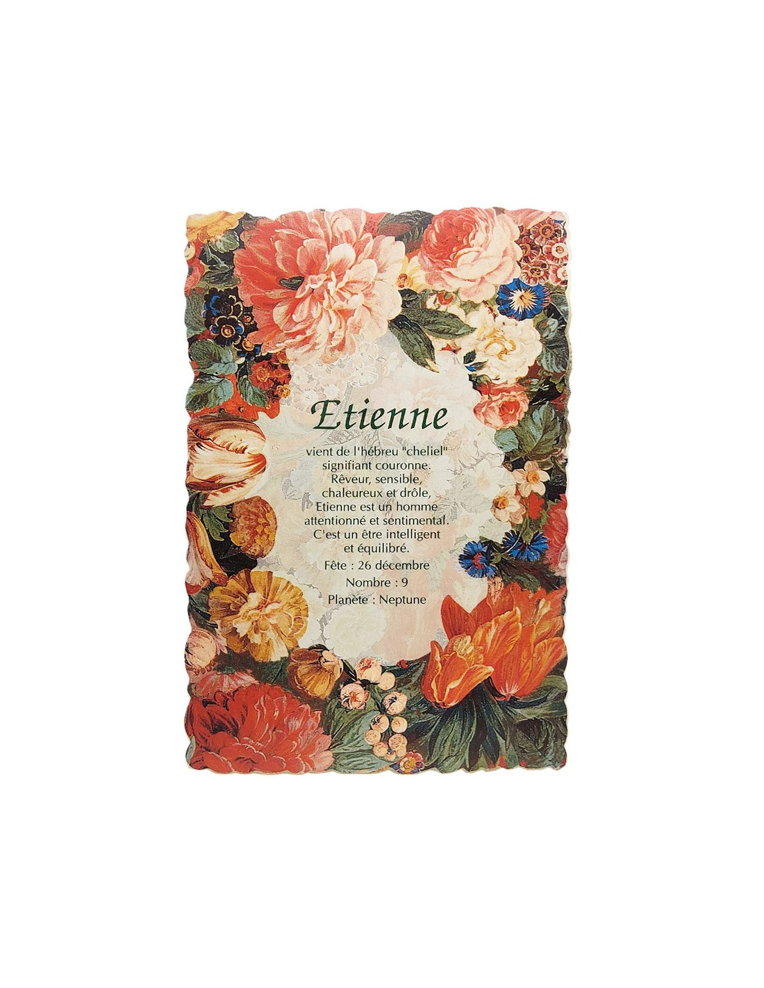 This personalized postcard presents a first name, its etymological meaning, character, day of celebration, lucky number and planet. Printed on high-quality cardboard with an elegant die-cut, it's adorned with a colorful vintage-style floral frame. Perfect for a simple, original gift for a birthday, christening or symbolic note. A great way to offer a nod to a loved one's identity.