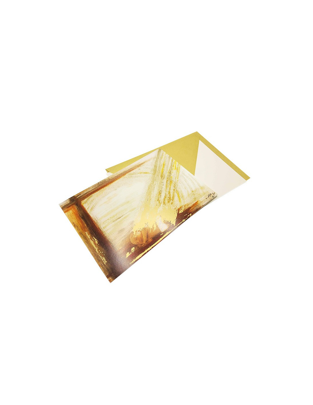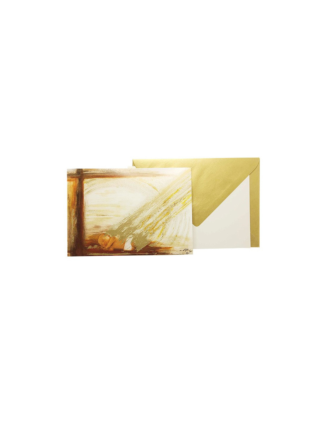 Celebrate the arrival of a new baby with this beautiful and delicate greeting card. Worthy of an art gallery with its brushstrokes, the card is illustrated with a baby touched by a golden ray of sunshine. The card is printed with gold foil, enhancing the painting. The inside of the card is blank, perfect for writing a personal message to the newborn's family. There is also a thinner, more refined paper for writing more to the baby's parents or if you prefer not to write on the card. An envelope is provided with the card, also in metallic gold.