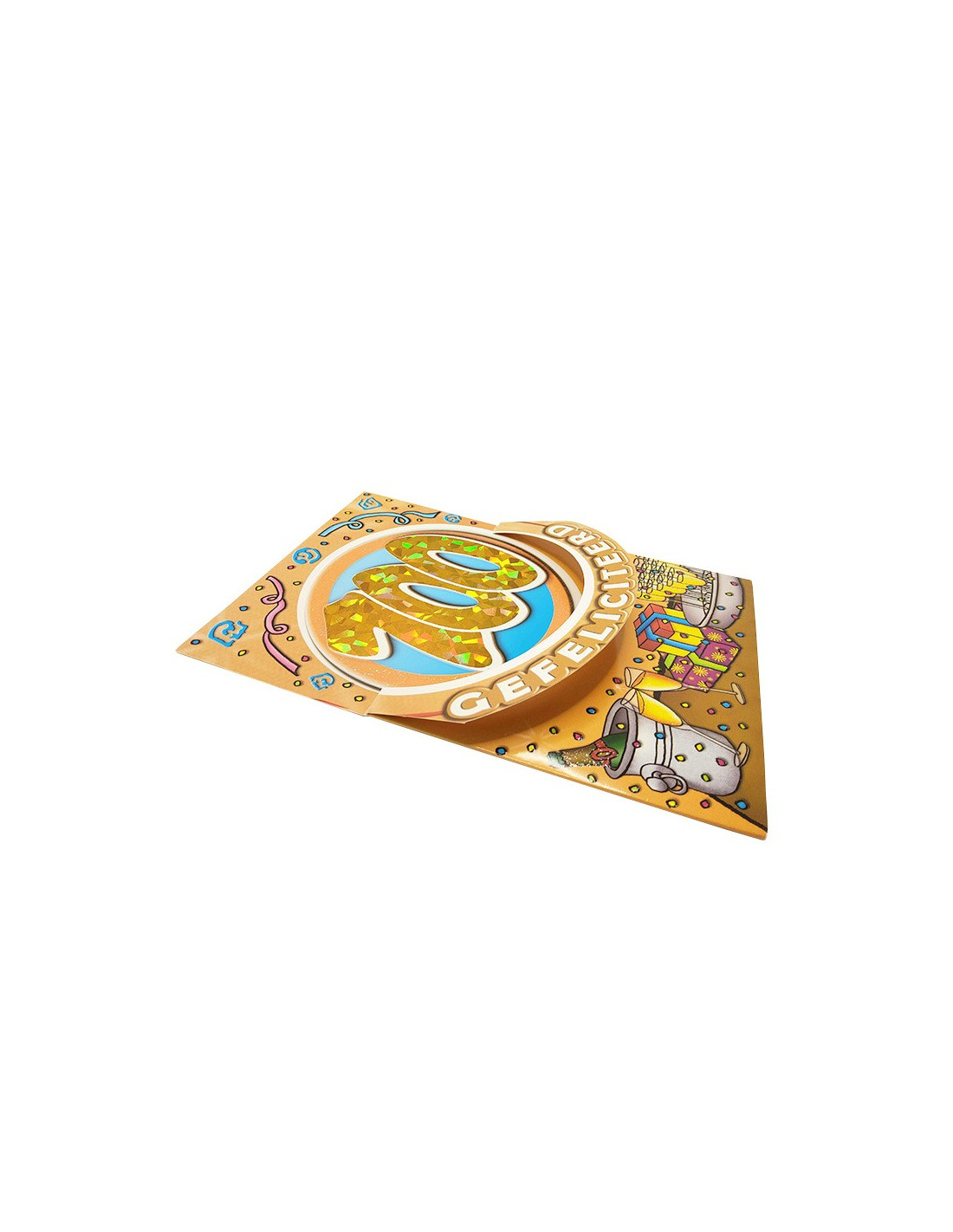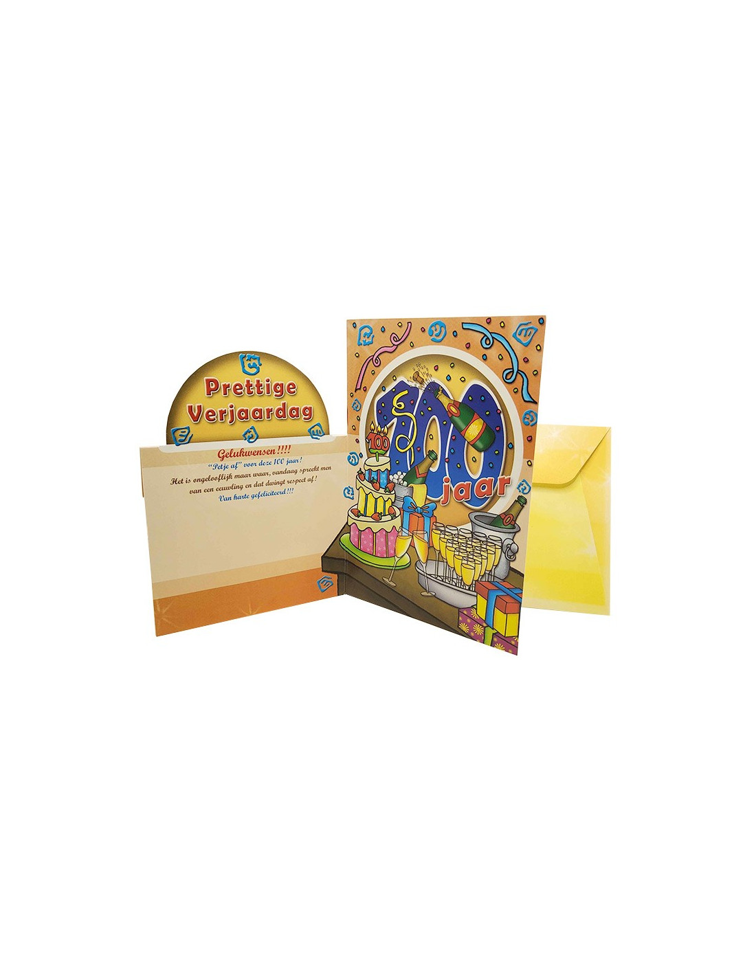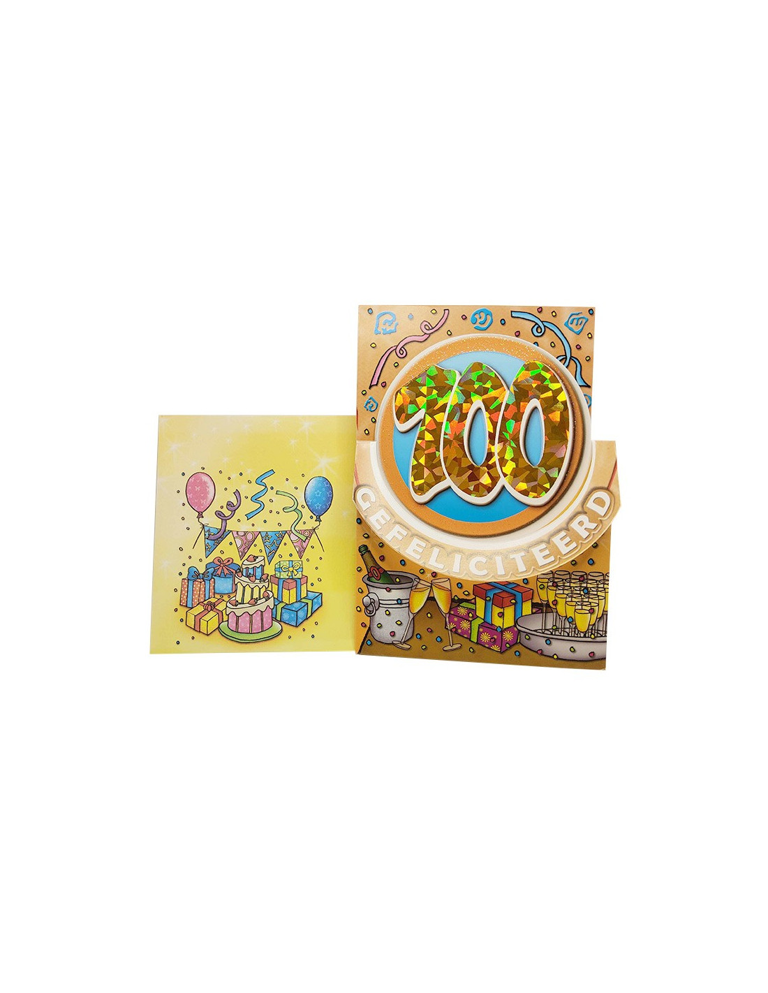 A hundredth birthday is an incredible event! Celebrate your loved one's century with this birthday card, decorated with glitter and a shiny effect. The card has an original cut-out design that highlights the number of years being celebrated. Accompanied by a thoughtful message inside, there is also space for you to add a few personal words. The card comes with a matching envelope. The text is in Dutch only.