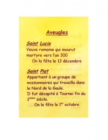 This card is a small, discreet tool for praying to your patron saints. It is useful for people who are blind, visually impaired, or who work with the blind, and explains in a few words the patron saints who help to relieve or cure them: Saint Lucy and Saint Piat. On the back is a short prayer dedicated to Jesus and the grace of the patron saints to comfort in effort, strengthen in faith, overcome obstacles, and protect from everyday evils.