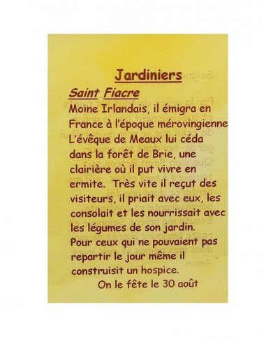 This card is a small, discreet tool for praying to your patron saints. It is intended for gardeners and all those involved in their care and explains their patron saint in a few words: Saint Fiacre. On the back is a short prayer dedicated to Jesus and, through the grace of the patron saints, to comfort in your efforts, strengthen your faith, overcome obstacles, and protect you from everyday ills.