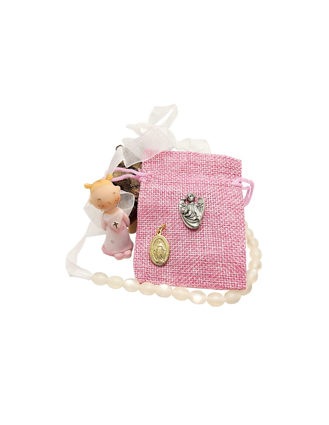 This pouch is ideal for a birth or baptism gift. The pink pouch contains a pink lucky child statuette, a protective angel pin and a silver and blue enameled medal of the Virgin Mary and the apparition of Lourdes.