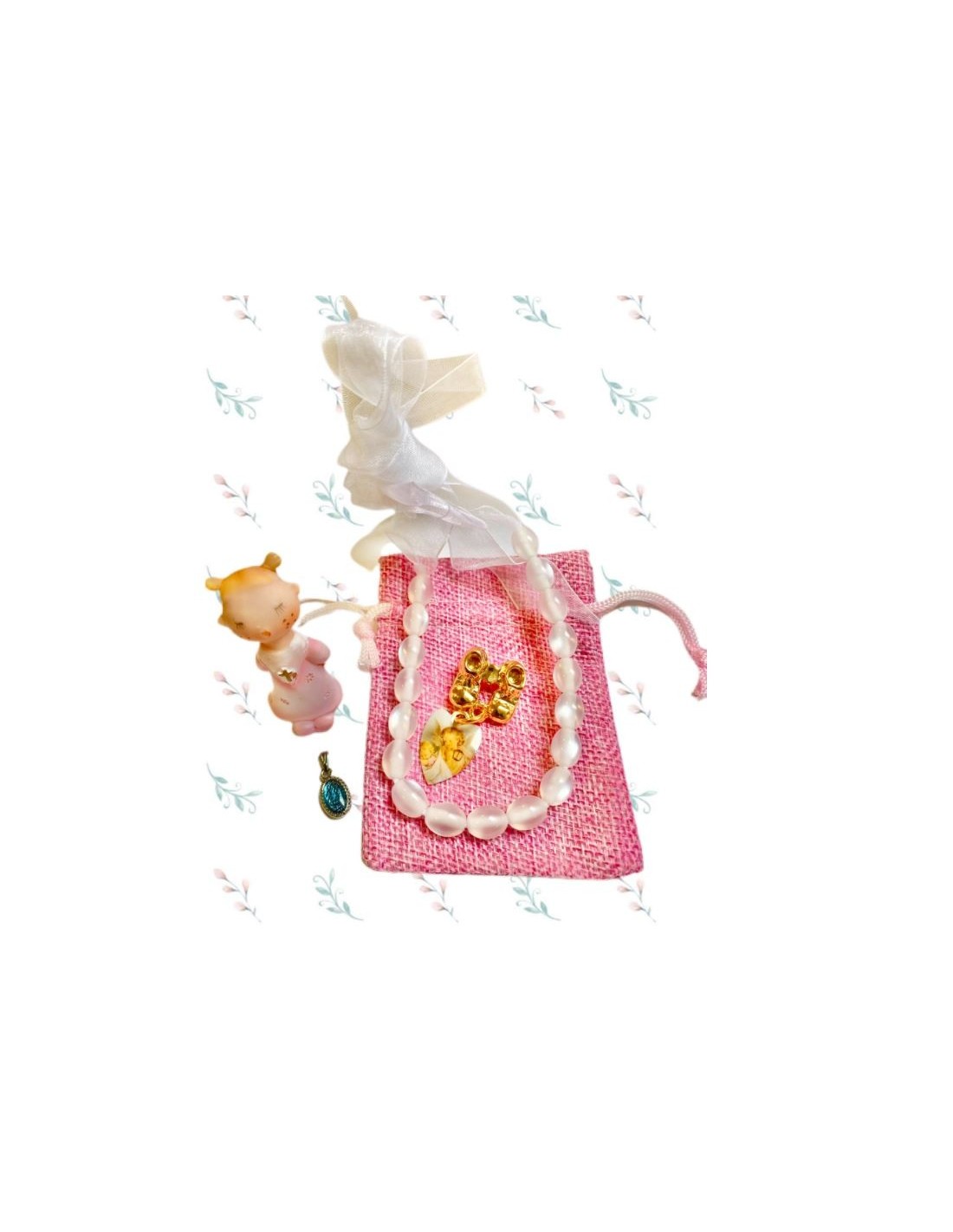 This pouch is ideal for a birth or baptism gift. The pink pouch contains a pink lucky child statuette, a golden brooch in the shape of small shoes and a heart with the image of a protective angel as well as a silver and blue enamelled medal of the Virgin Mary and the apparition of Lourdes.