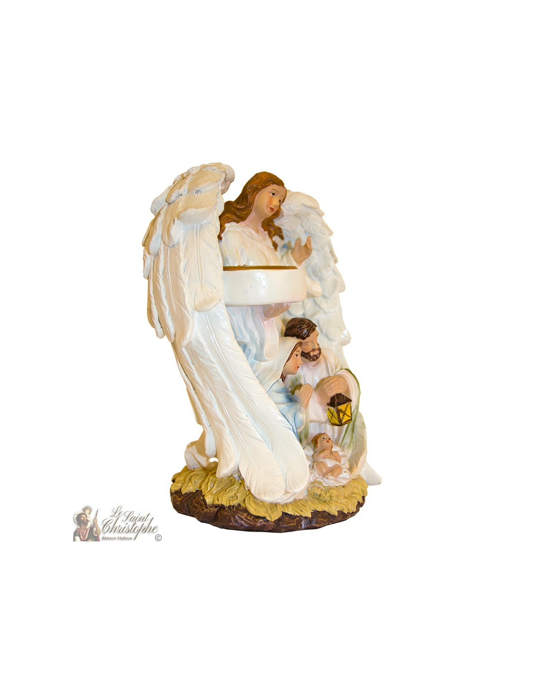 Resin statue, painted and hand made, illustrating the birth of Christ surrounded by Mary and Joseph and a guardian angel carrying a candle. A simple and luminous nativity scene to bring a touch of tenderness in Christmas decoration or for the whole year.
