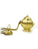 This gilded copper incense burner, entirely worked by hand, is decorated with openings in the shape of flower petals on its lid to let the incense wisps out. The interior is equipped with a container to receive the coal and facilitate its use.