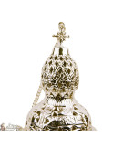 This gilded censer to hang is engraved on its surface with a beautiful plant frieze and topped by a richly decorated cross. The lid has an easy and high grip, especially thanks to the cross and the hop shape which makes it even bigger. The holes are discreet, cut into the white spaces of the frieze and giving it more relief. The censer also contains a grid to deposit the pieces and grains of incense. The long chains allow it to be hung.