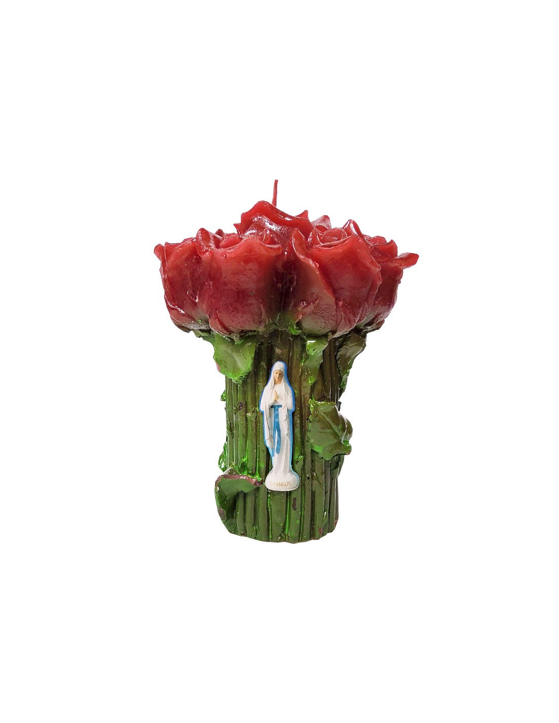 Candle with red roses and pin of the Virgin of the Poor of Banneux