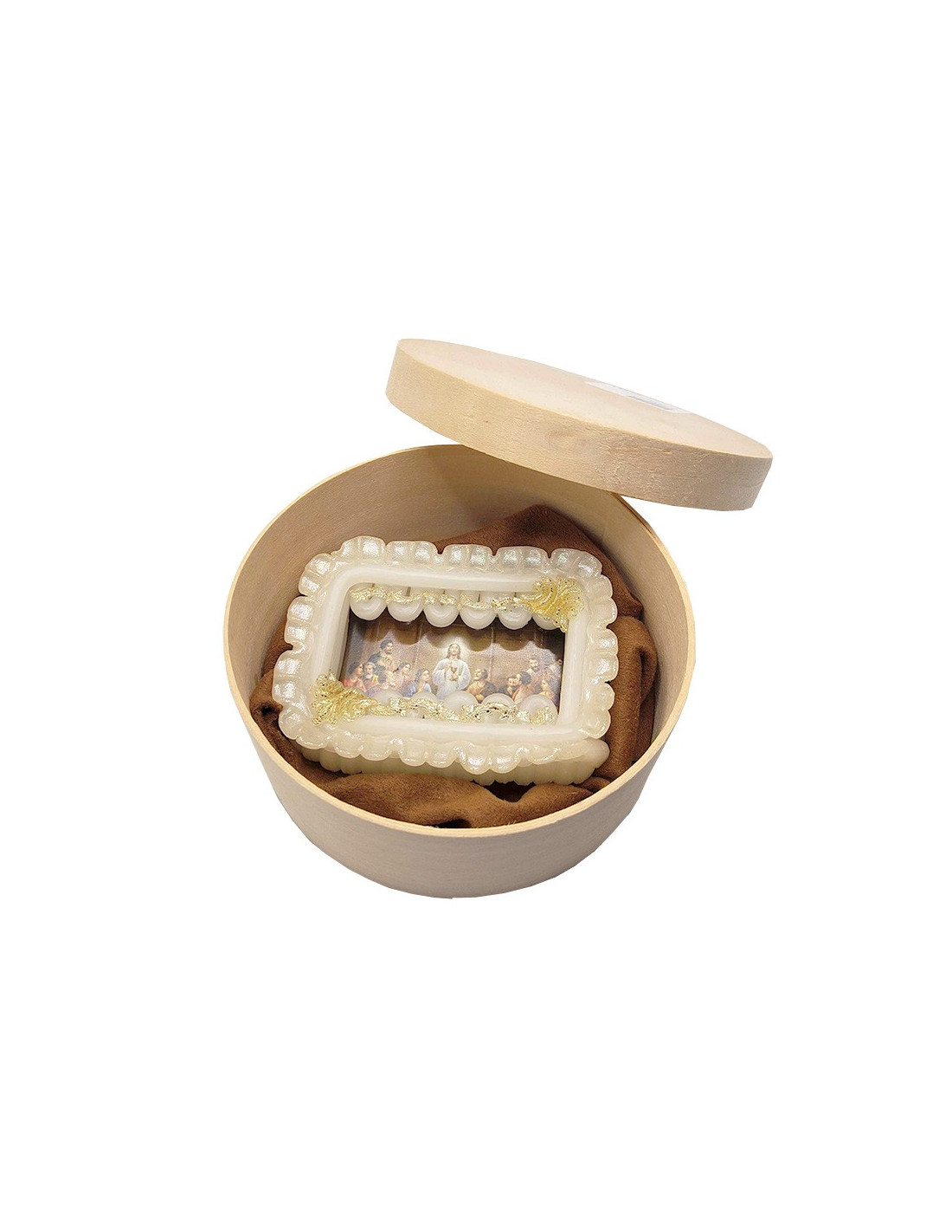 A decorative novena candle, uniquely crafted in wax with an illustration of the Last Supper. The wax forms a delicate pearly drape around the image of Jesus and his Apostles. Some parts are painted gold to enhance the colors of the illustration. A lovely gift idea for a communion.