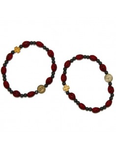 Bracelet made of light wood and natural olive wood beads. The cross-shaped pendant bears the word "Medjugorje" in reference to the Marian apparitions. The beads feature saintly images, including the Divine Mercy. Can be used as a decade rosary.