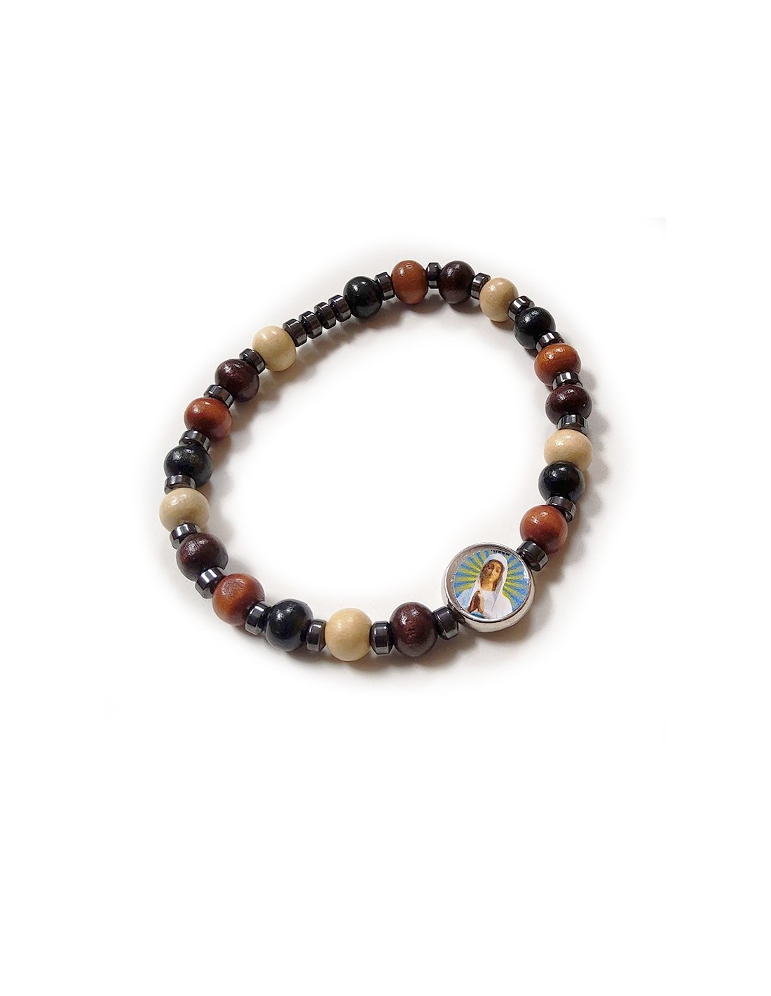 Elastic bracelet in wood and hematite, also known as dizainier, with image of the Virgin of Banneux: Our Lady of the Poor. The wooden beads are tinted white, brown and black.