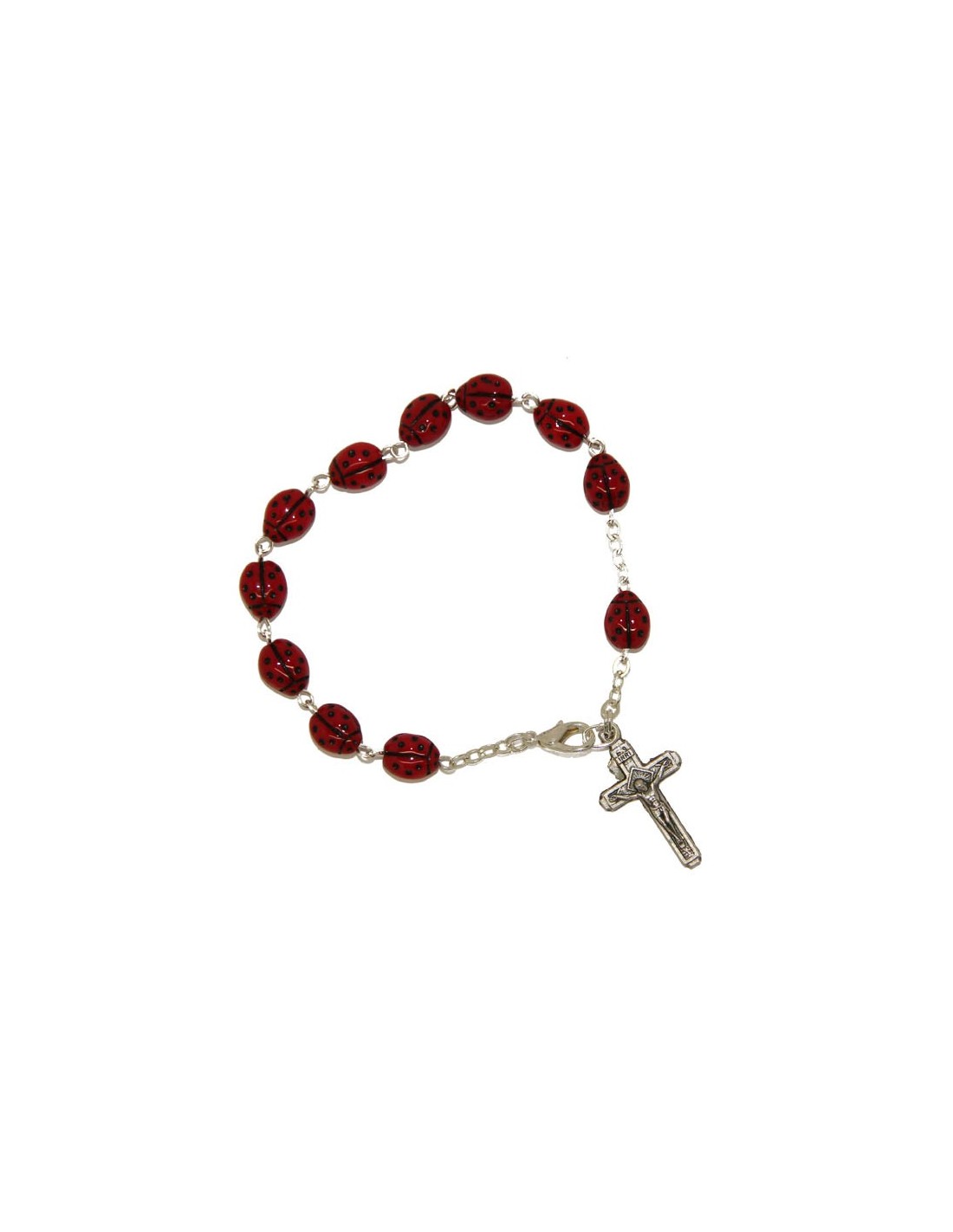 This rosary bracelet, mounted on a fine silver-plated chain, is composed of ten ladybug-shaped beads and a small hanging cross. The charming ladybug charms add a playful and symbolic touch. With its length and adjustable system, this unisex model (children and adults) can be worn as everyday jewelry or as a prayer aid. Lightweight and discreet, it slips easily onto your wrist to accompany you in meditation or on the go. The ladybug is often seen as a symbol of luck, happiness, and optimism. It is also considered a sign of comfort and spiritual reassurance, especially after the loss of a loved one. It is often associated with joy, innocence, and inner peace.