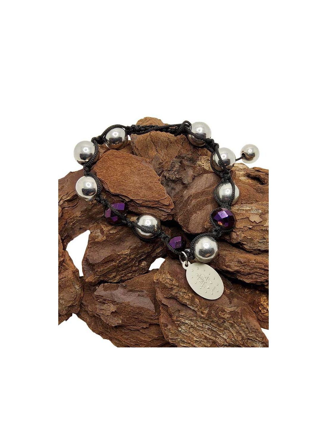 This shamballa bracelet combines aesthetics and spirituality. Mounted on an adjustable black cord, it combines shiny gray metallic-effect pearls with opaque faceted mauve pearls. It is adorned with a fancy metal medal representing the Miraculous Virgin. This medal is a symbol of divine protection. It is worn to ask for graces or support in difficult times. An inspired and inspiring bracelet, both modern and meaningful.