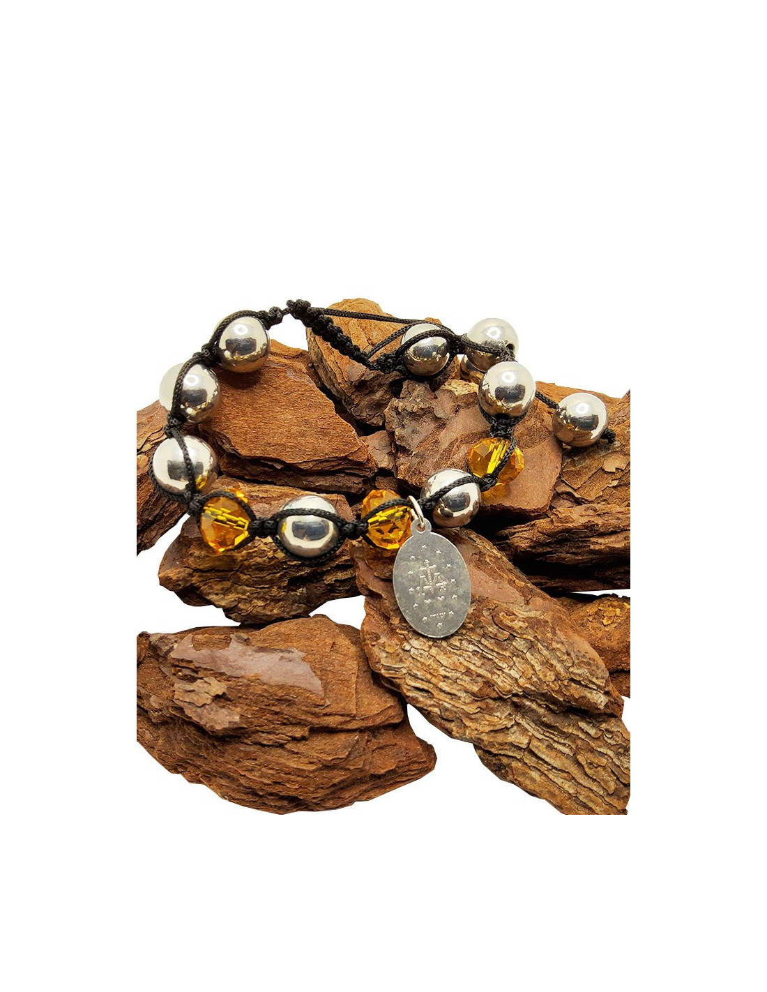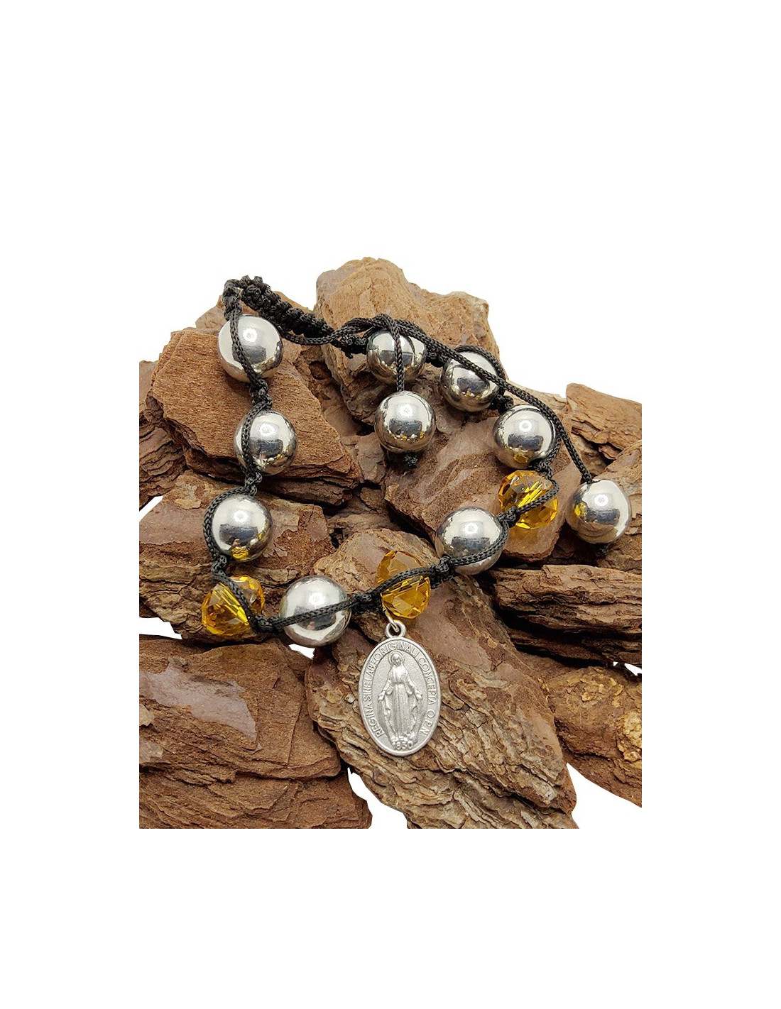 This shamballa bracelet blends aesthetics and spirituality. Mounted on an adjustable black cord, it combines shiny gray metallic-effect beads and faceted yellow beads. It is adorned with a decorative metal medal representing the Miraculous Virgin. This medal is a symbol of divine protection. It is worn to ask for graces or support in difficult times. An inspired and inspiring bracelet, both modern and meaningful. This unisex bracelet is adjustable thanks to the macramé knots, making it suitable for both large and small wrists!