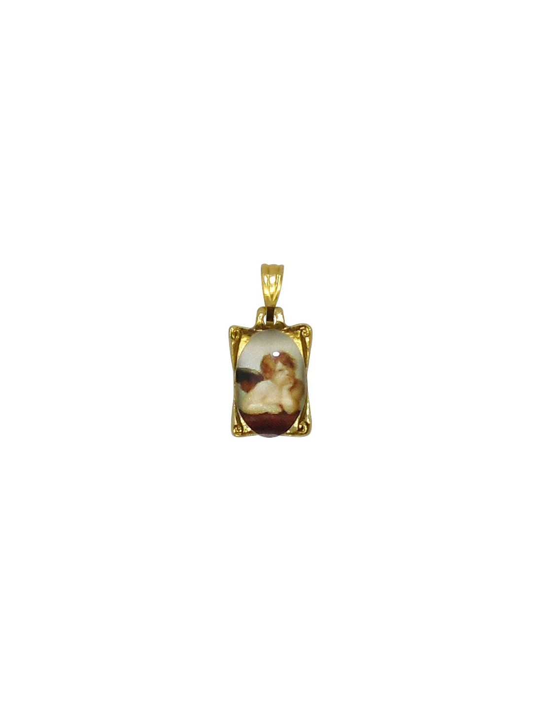 Angel medal in transparent enamel and gilded metal, nickel-free. This small, fancy pendant is rectangular. The front features a slightly iridescent image of a leaning, pensive cherub, covered with a layer of protective enamel with a shiny effect.