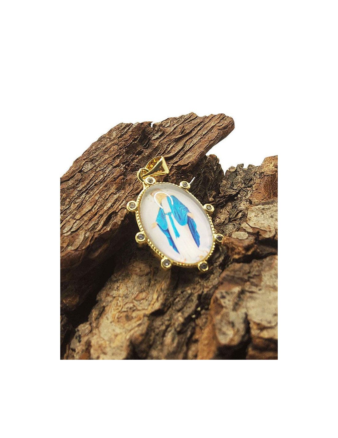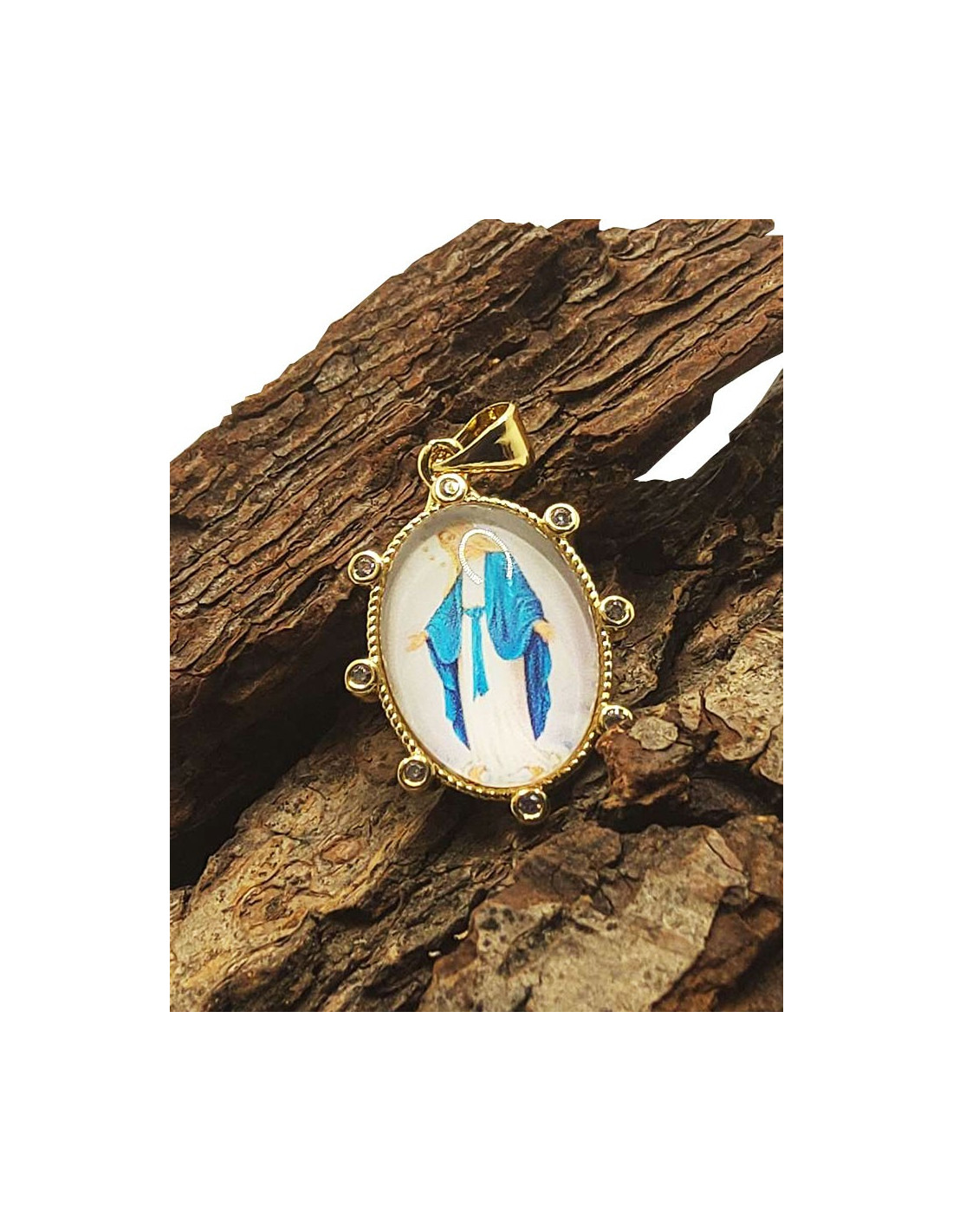 Miraculous Virgin Medal in gold-plated metal set with rhinestones. The image of Mary is depicted in vivid colors. The illustration is protected by a layer of domed resin, creating a beautiful cabochon. The edge of the medal is decorated and set with rhinestones. The Miraculous Virgin is a symbol of love, protection, healing, and good health. This is a beautiful gift for a loved one or for yourself, a discreet piece of religious jewelry.