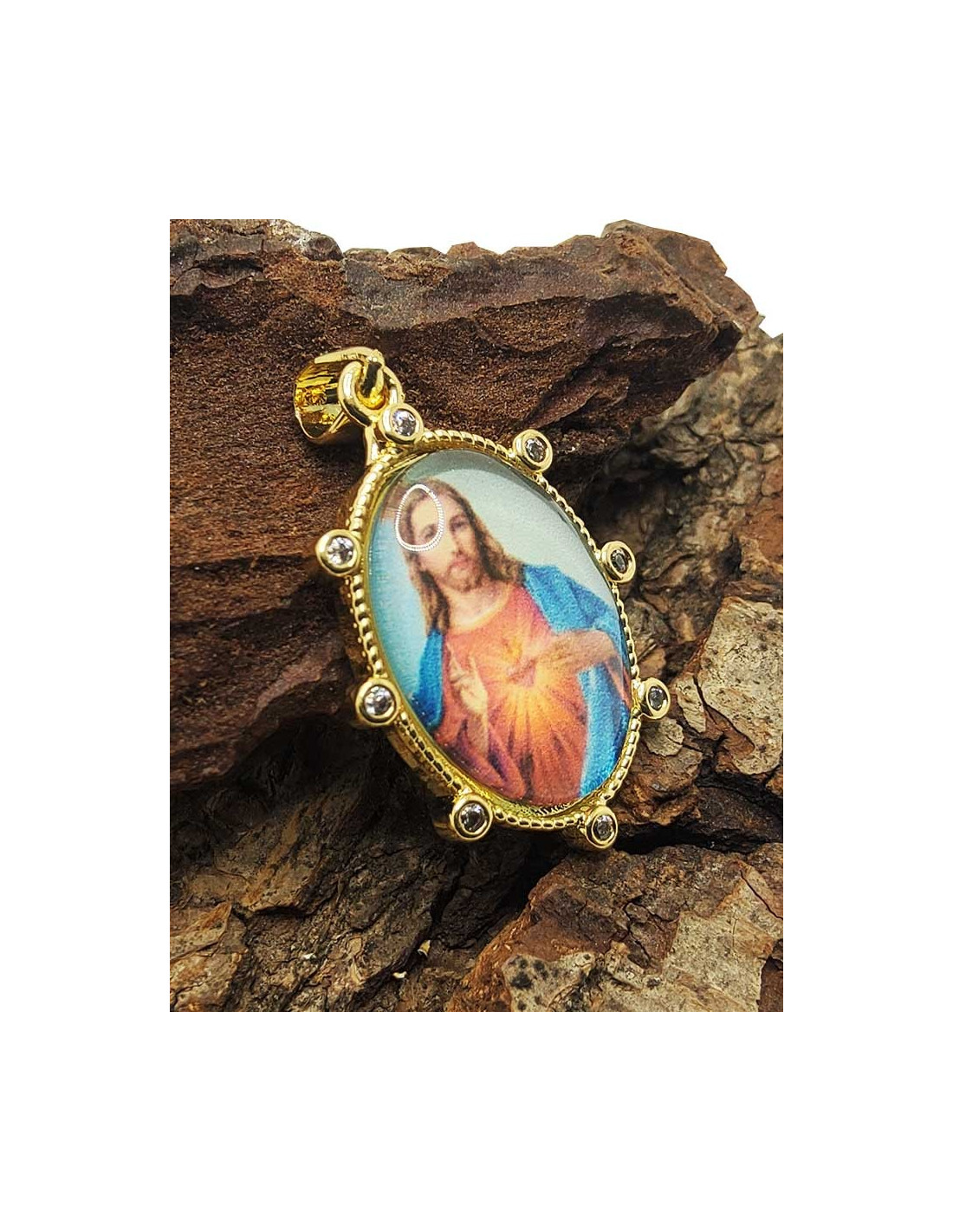 Sacred Heart of Jesus medal in fancy gold metal set with rhinestones. The image of Jesus Christ depicts him in soft, pastel colors for the background. The image of Jesus is protected by a domed resin layer, creating an attractive cabochon. The perimeter of the medal is decorated and set with rhinestones. The Sacred Heart of Jesus is a symbol of unconditional love and forgiveness. It's a beautiful gift for a loved one or for yourself, a discreet piece of religious jewelry.