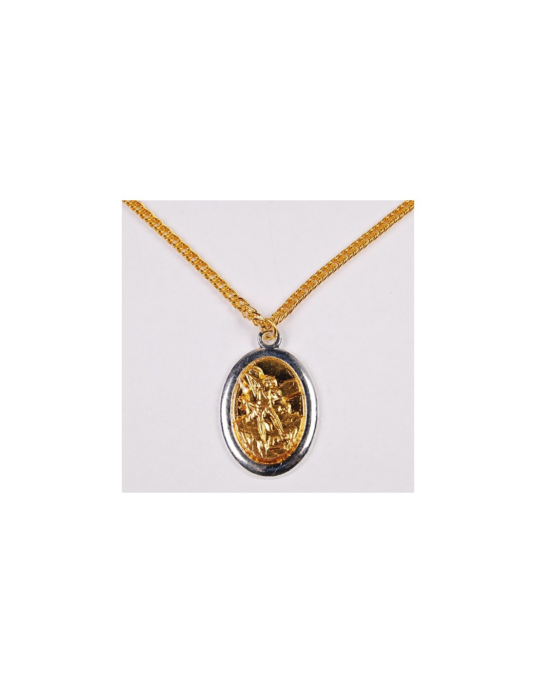 Fancy necklace with gold-plated Archangel Saint Michael medal in pendant, circled by a silver outline. The chain has a clip clasp.