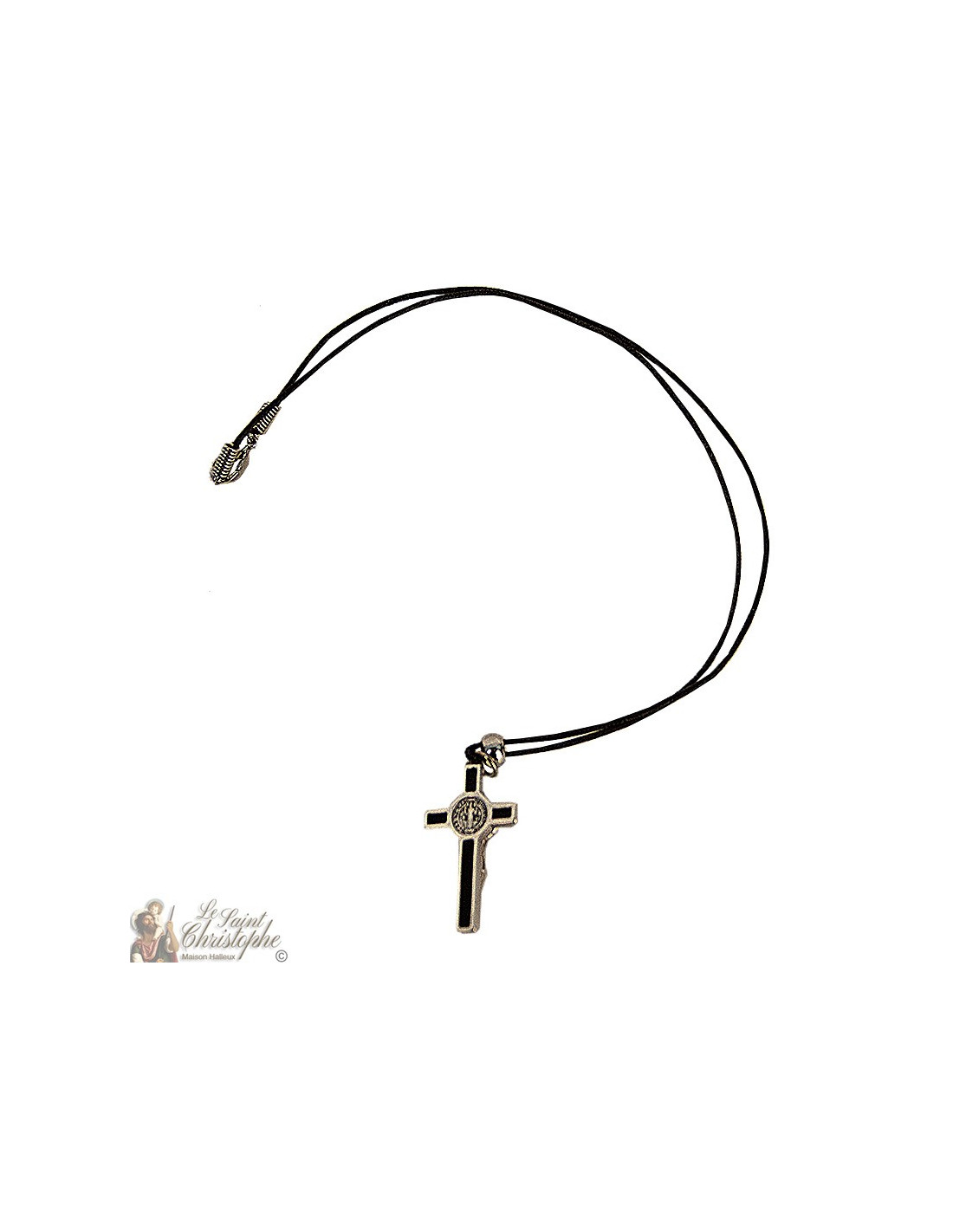 The necklace is composed of a leather cord and a metal pendant representing the cross of Jesus and the medal of St. Benedict. The attachment is a metal snap hook.
