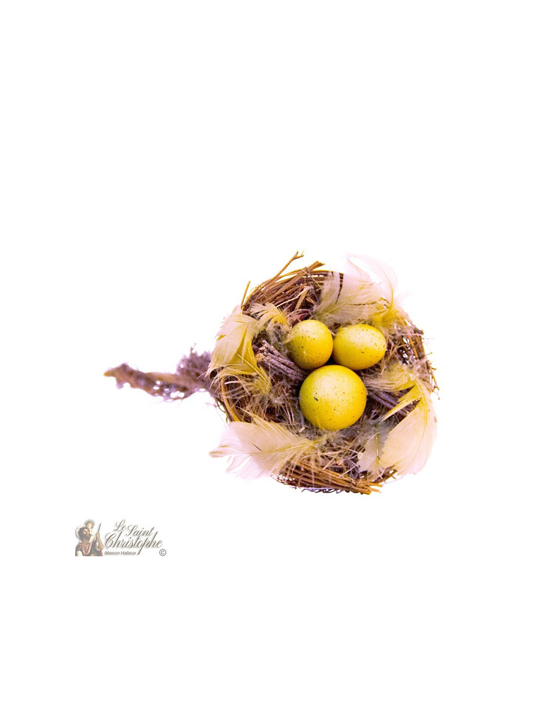Complete box of 6 artificial flowers composed of branches intertwined around a long solid stem where a nest with a few spotted eggs surrounded by feathers stands out.