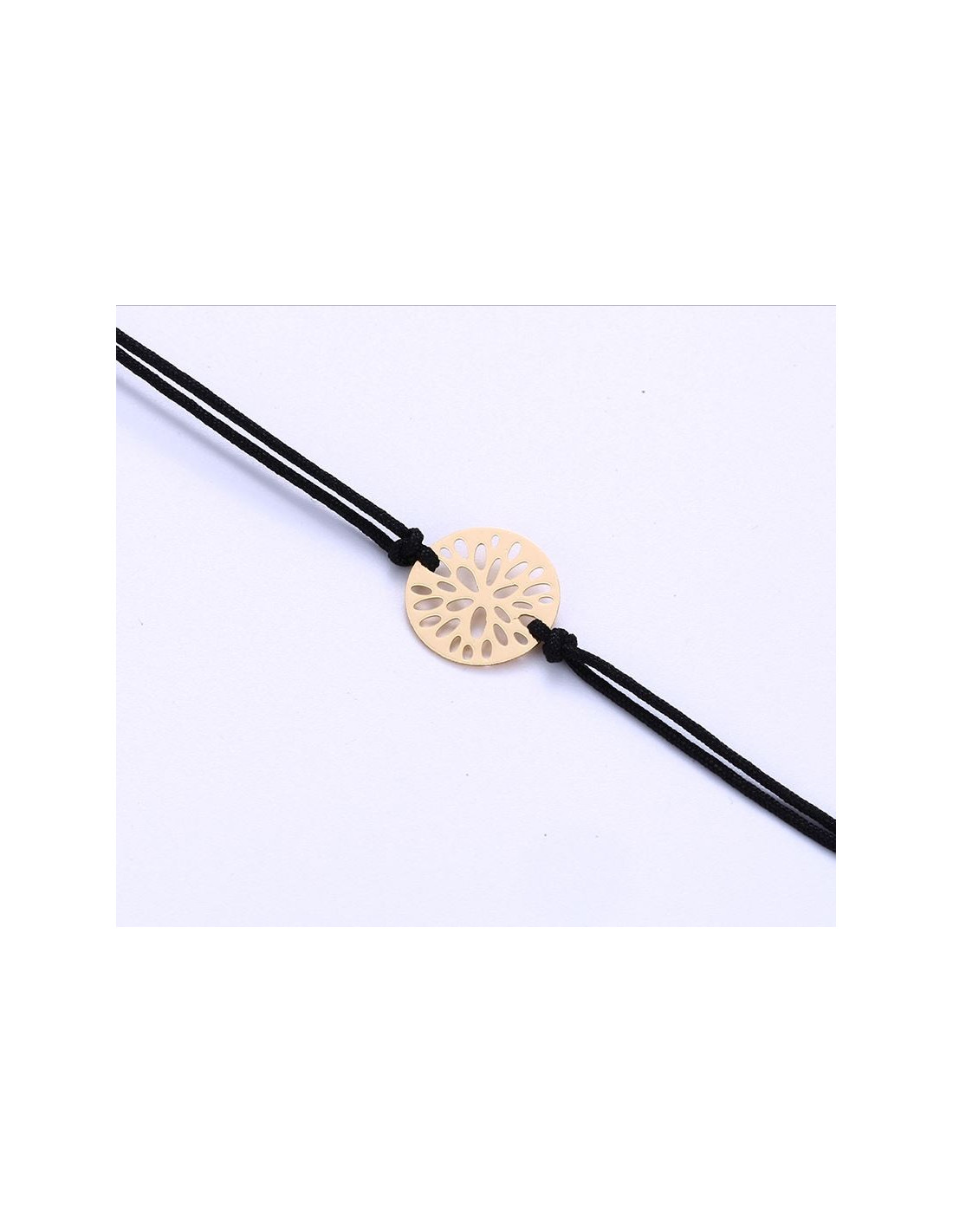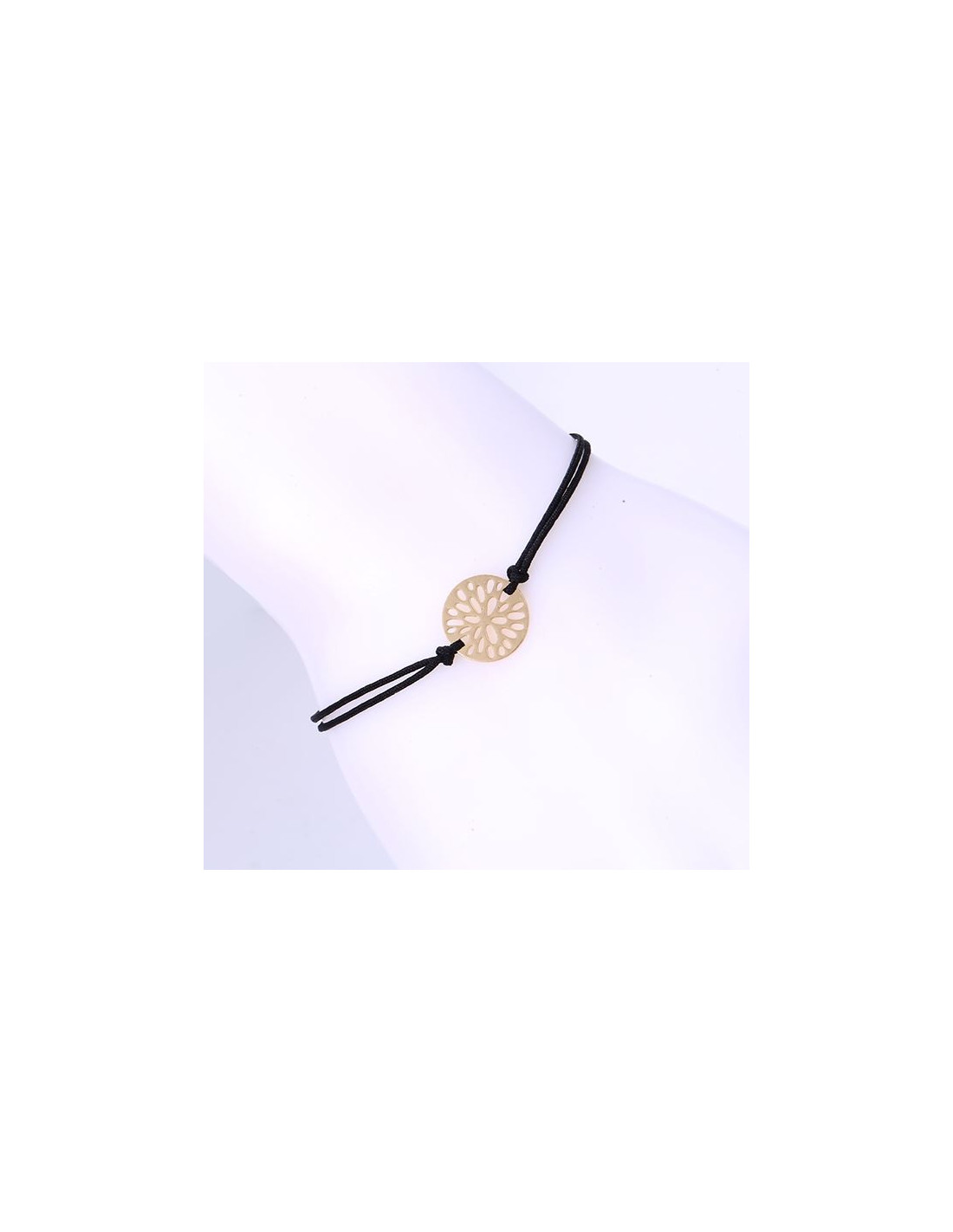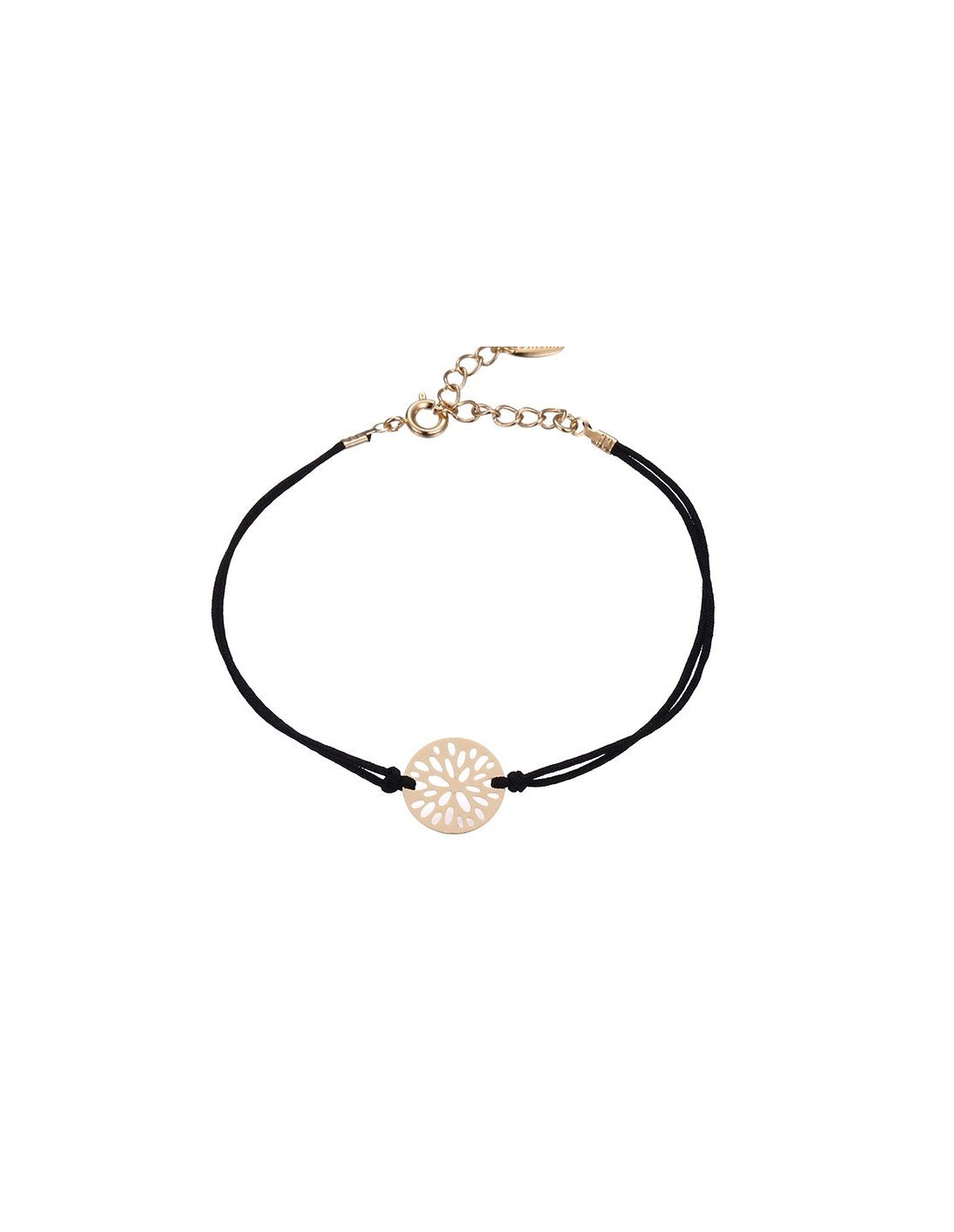 Black cord bracelet and engraved pearl. The pearl, the main piece of the bracelet, is engraved to look like a flower with multiple petals. The metal parts are all 18K gold plated.