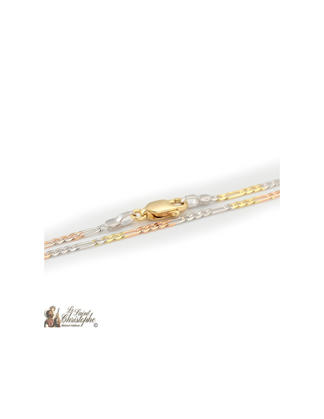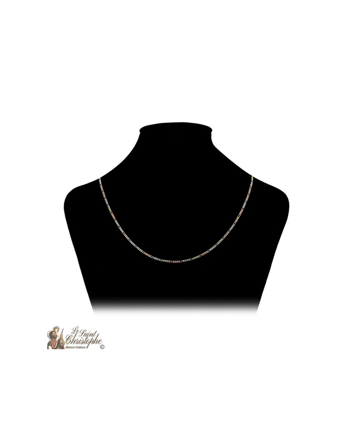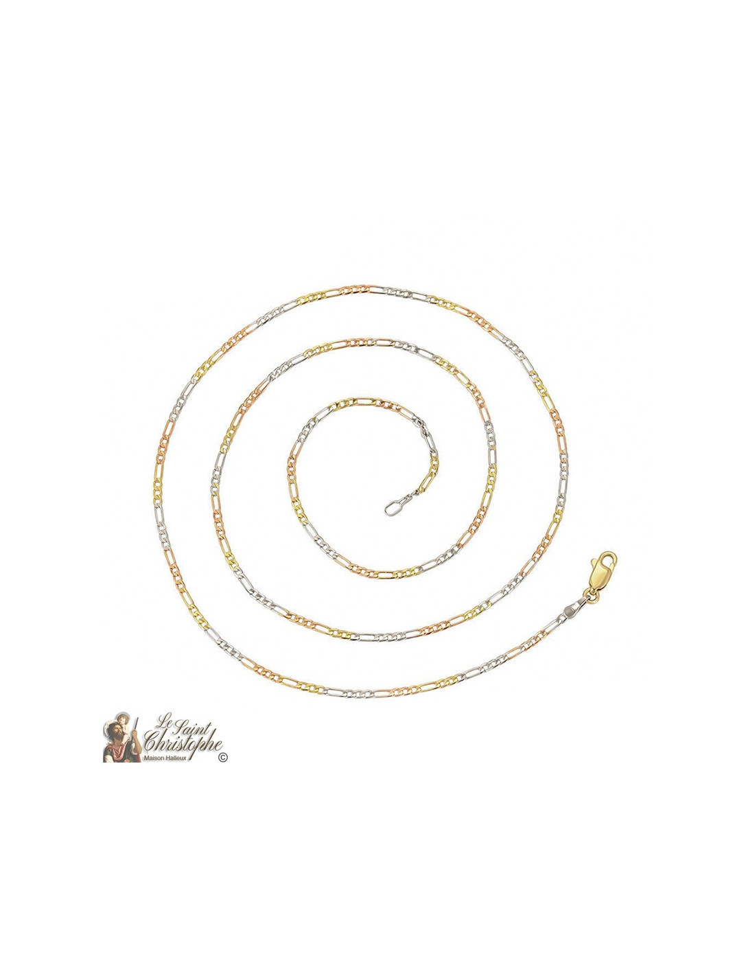 60 cm figaro chain plated with yellow gold, rose gold and silver with links of varying sizes. An asymmetrical design with noble colors for a modern style.