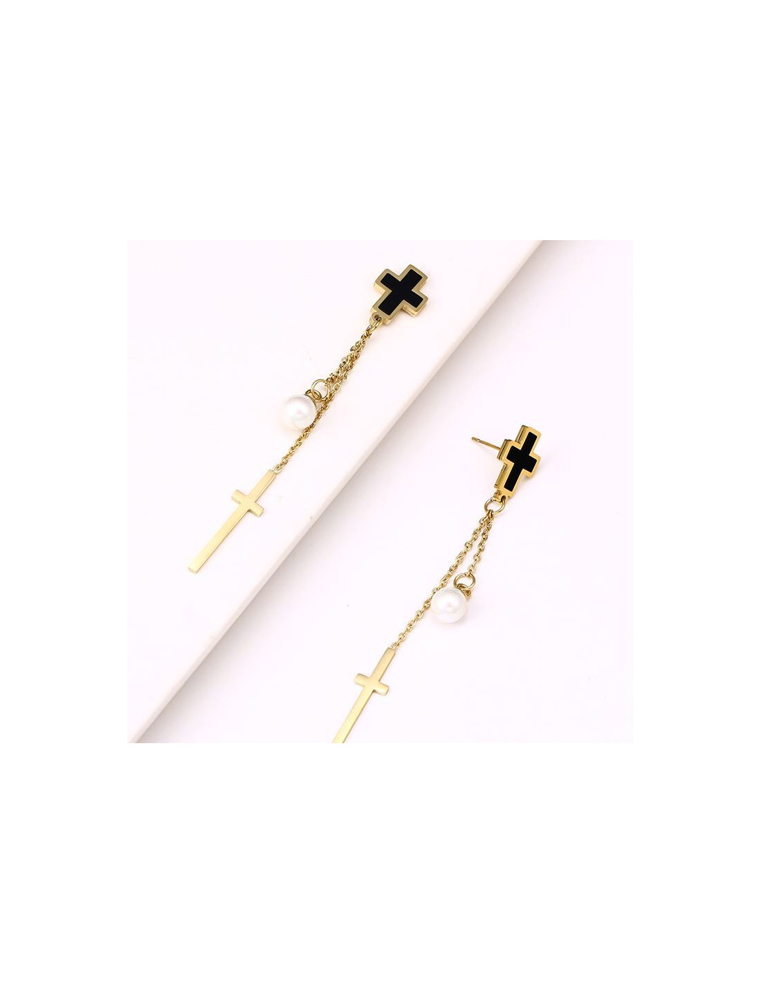 Earrings with white pearls and two golden crosses, one of which is varnished with black.