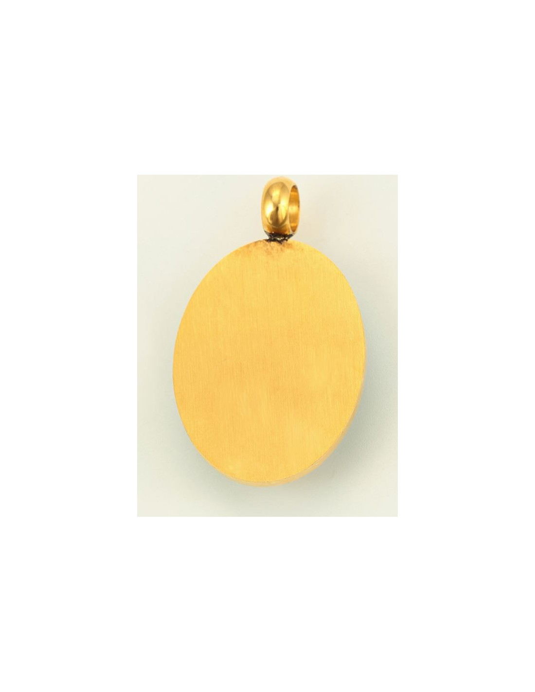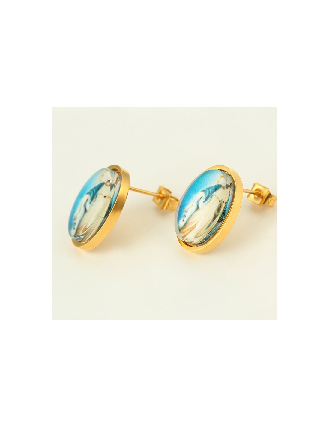 This set in stainless steel and 24 k gold plated is of a very beautiful finish. The set is oval, with pastel and soft images of the Miraculous Virgin.
