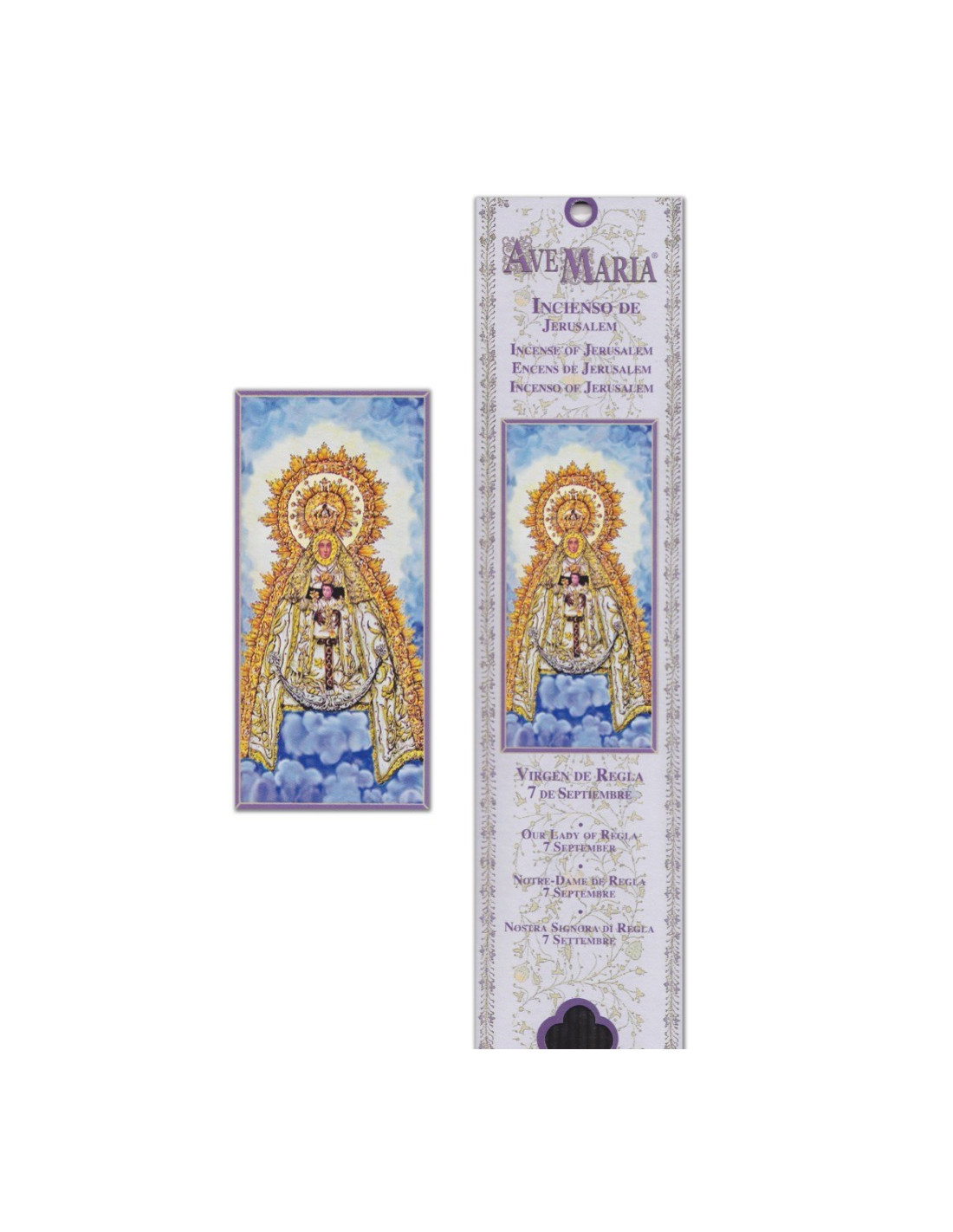 This pouch, with the image of the Virgin of Regla, in a golden dress and holding Christ in her arms on a celestial background, contains 15 sticks of natural incense with a jasmine perfume. It is mainly prayed on September 7. This incense is used for the protection of children, fertility and fecundity, financial abundance and the resolution of money problems.