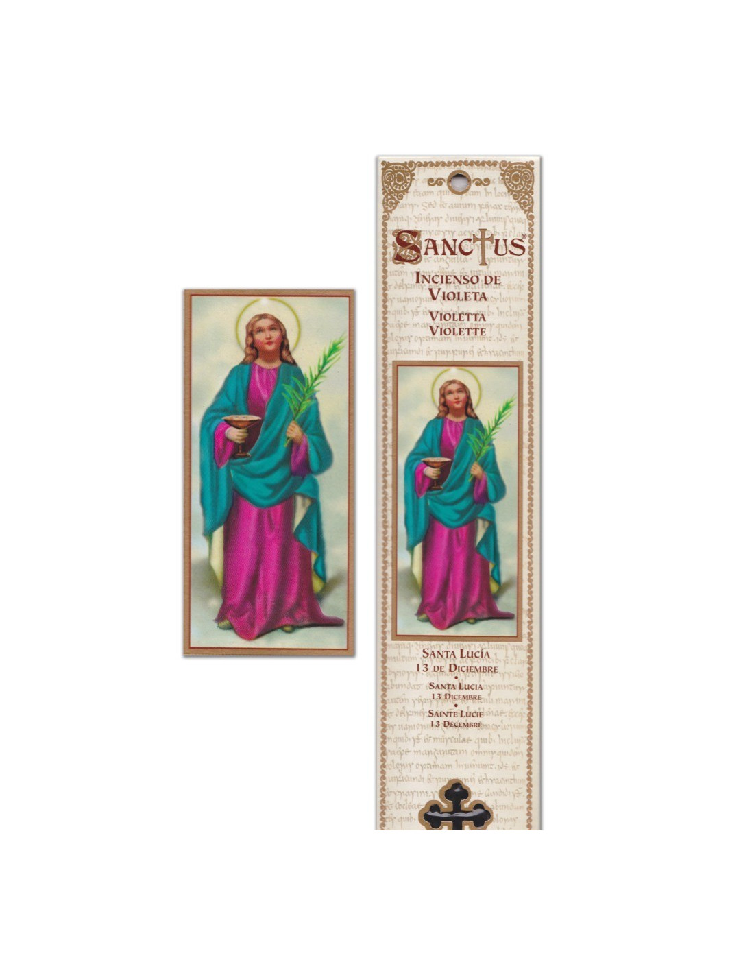 This pouch, with the image of Saint Lucy, holding a chalice and a branch all in bright colors, contains 15 sticks of natural incense scented with violet. It is prayed mainly on December 13. This incense, an excellent combination of perfume and the chosen saint, is recommended for everything related to the eyes, whether it is to help relieve an infection or an illness, or to open one's vision of the world and be more receptive to one's surroundings. It also helps to relieve sore throats and to express oneself better.