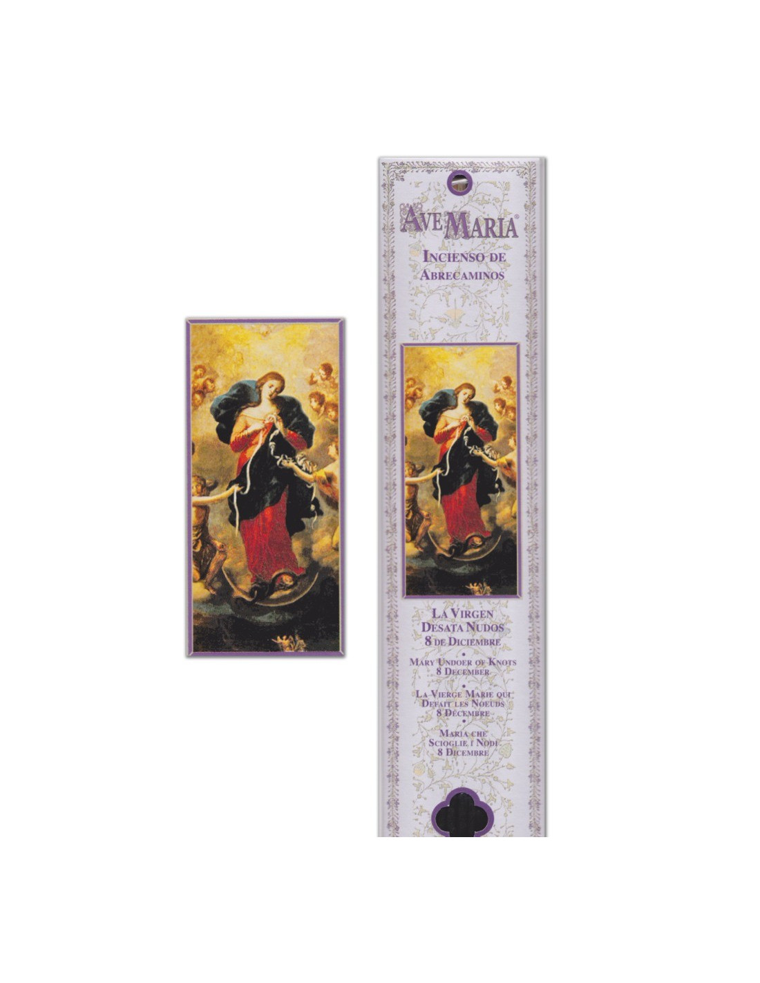 This bag, with the image of Mary who undoes the Knots surrounded by angels, contains 15 sticks of natural incense. It is prayed mainly on December 8. Mary who unties knots is prayed when we find ourselves in a situation that seems difficult and inextricable in our lives.