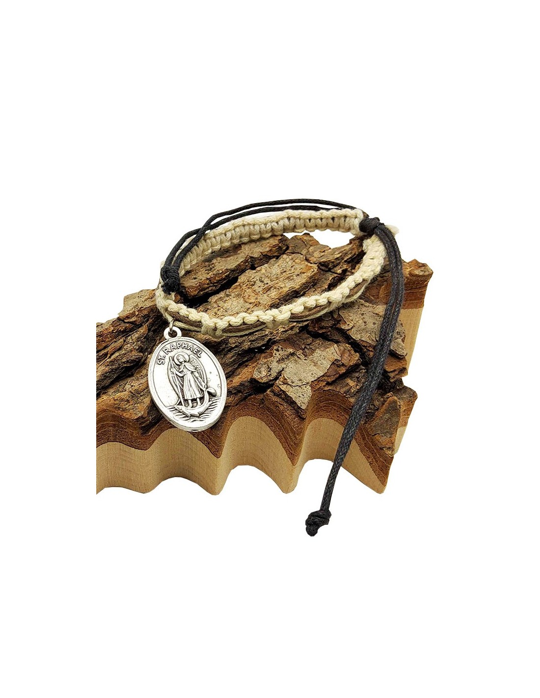 Bracelet in natural-colored braided cords with fancy metal medals of Archangel Saint Michael and Archangel Saint Raphael. The cords are white, black and brown. It's a natural, almost bohemian blend that goes easily with anything.