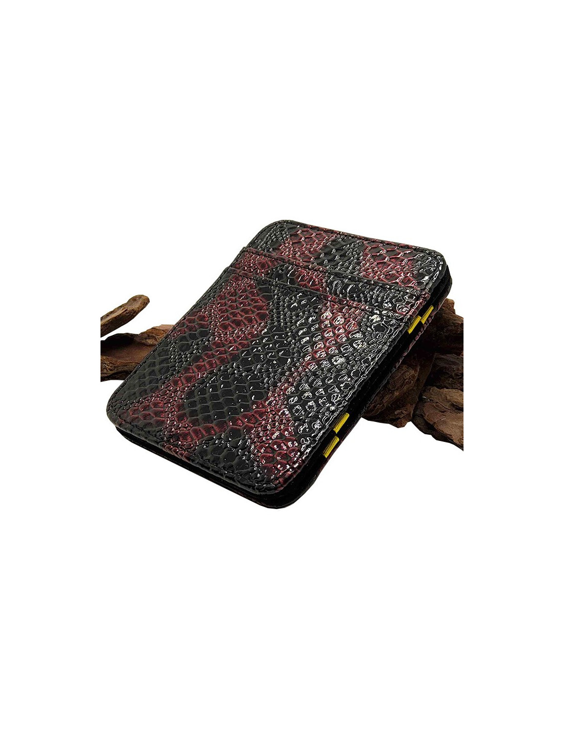 Black and red snake-effect leatherette magic ticket and card holder