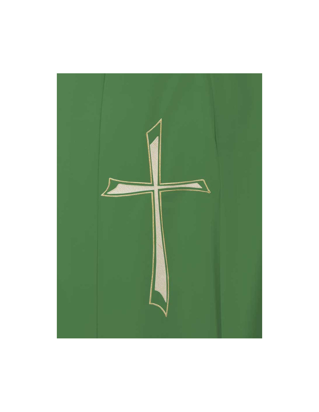 Emerald green priest's chasuble with a stylized cross stole, TAU cross style, in gold. The chasuble is decorated with a gold border. The embroidery is double-sided, meaning it appears on both the front and back.