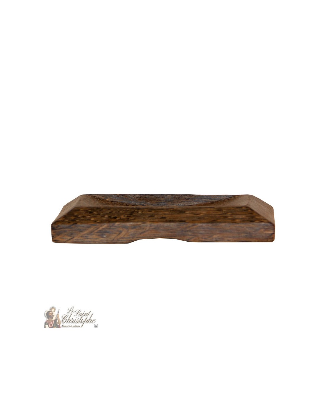 A natural wood soap dish, hand carved by our craftsmen, with a brown wood essence speckled with black. It is designed to hold solid hand soap. It is also suitable for any type of solid soap in general, such as solid shampoos.