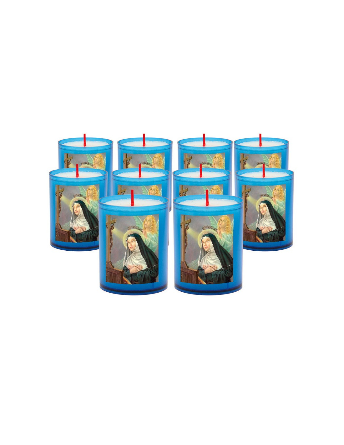 Blue night-light candles with the image of Saint Rita. Sold in packs of 10.