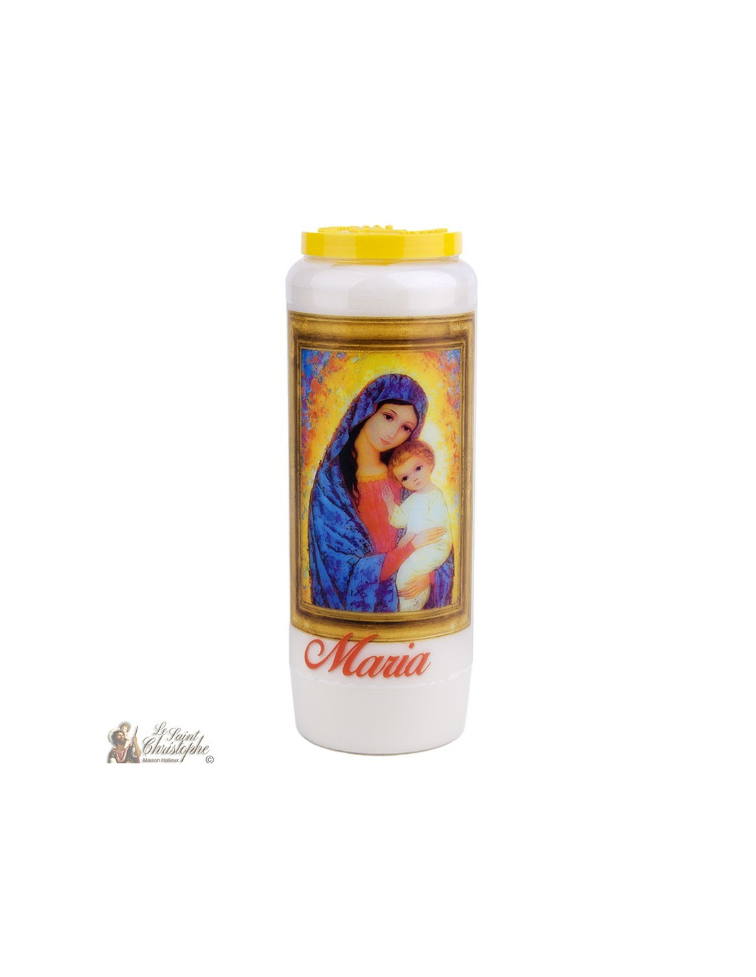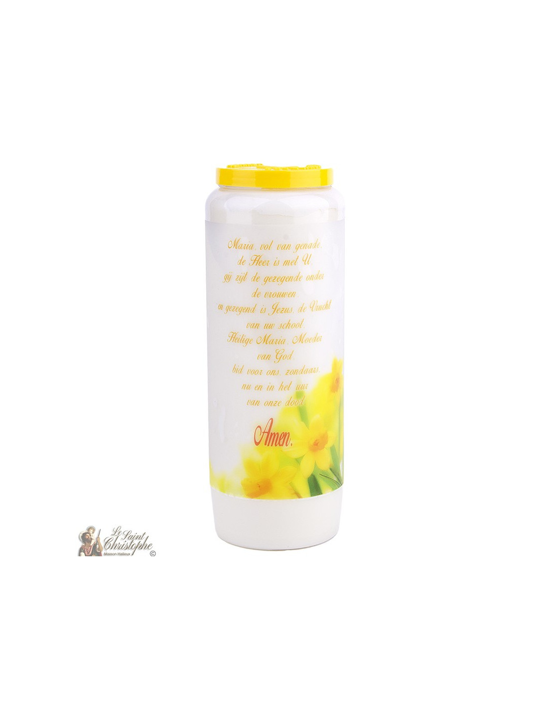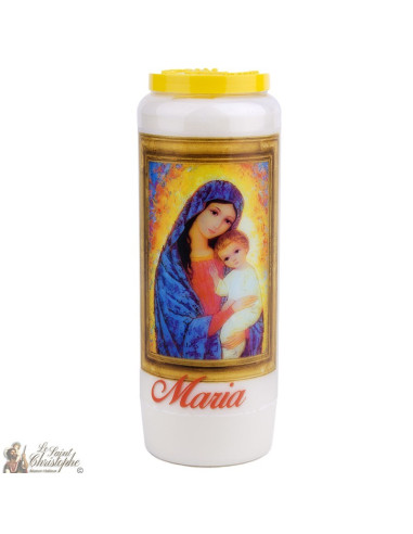 Novena candle with image of the Blessed Virgin with Child on front and Hail Mary prayer on back.
